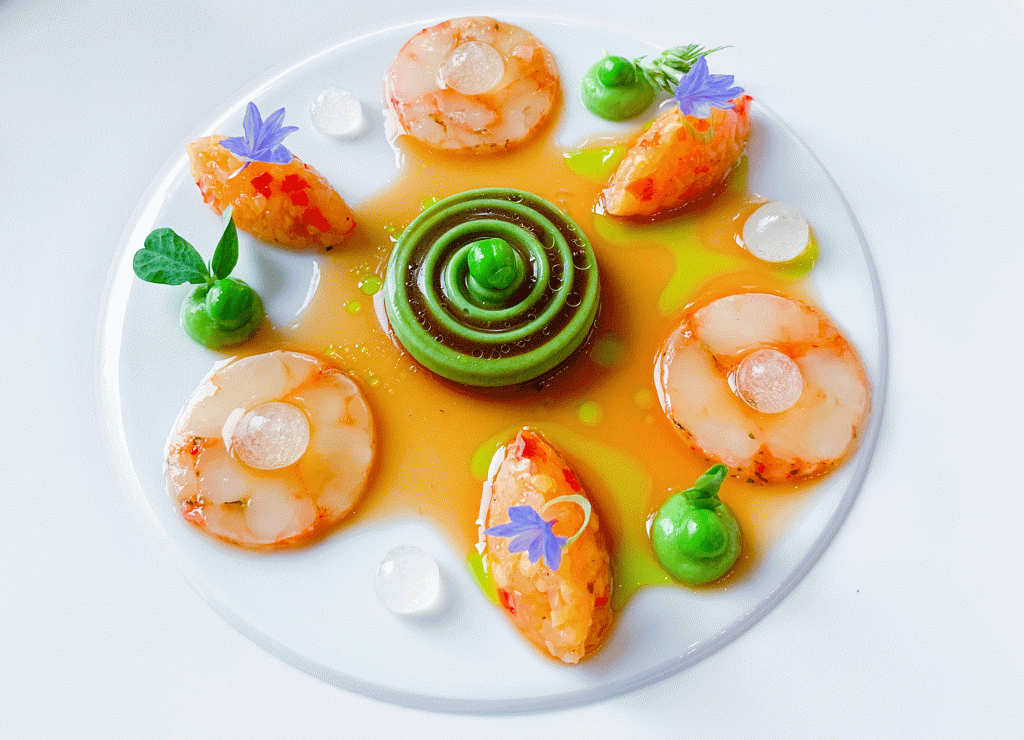 Erbsen in verschiedenen Varianten und ein ausgezeichnetes Birnengel begleiten den marinierten Kaisergranat. Man beachte vor allen Dingen die dünn geschnittenen Scheiben.