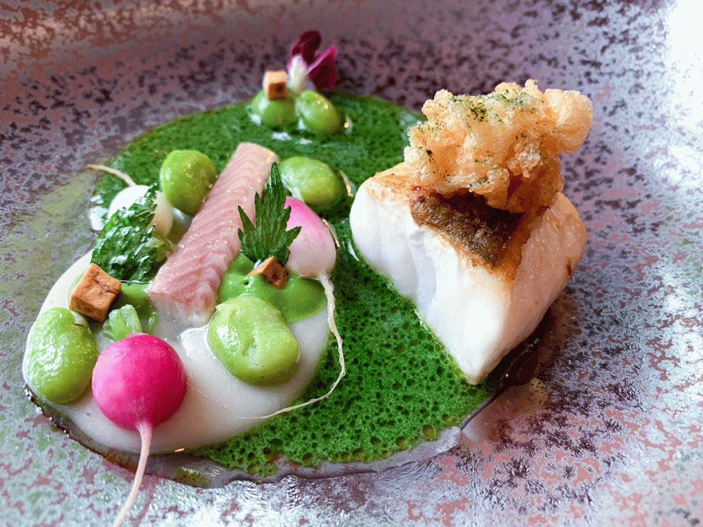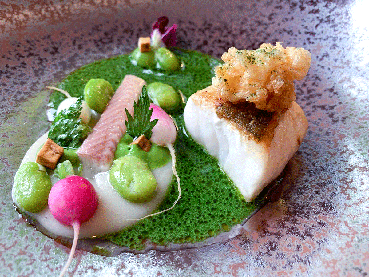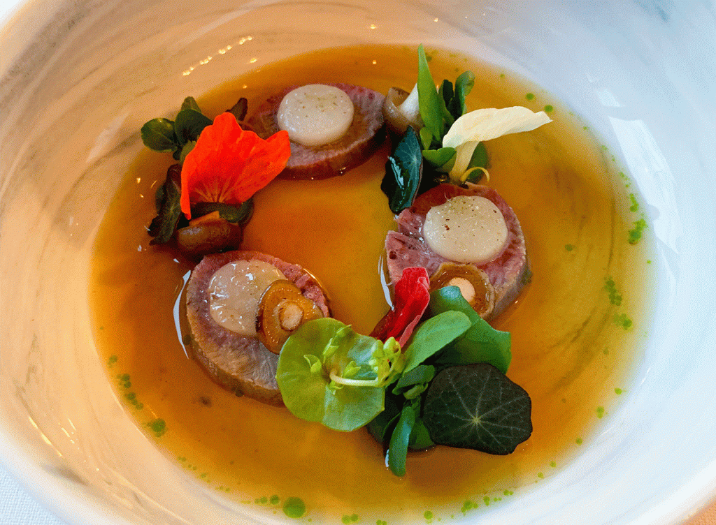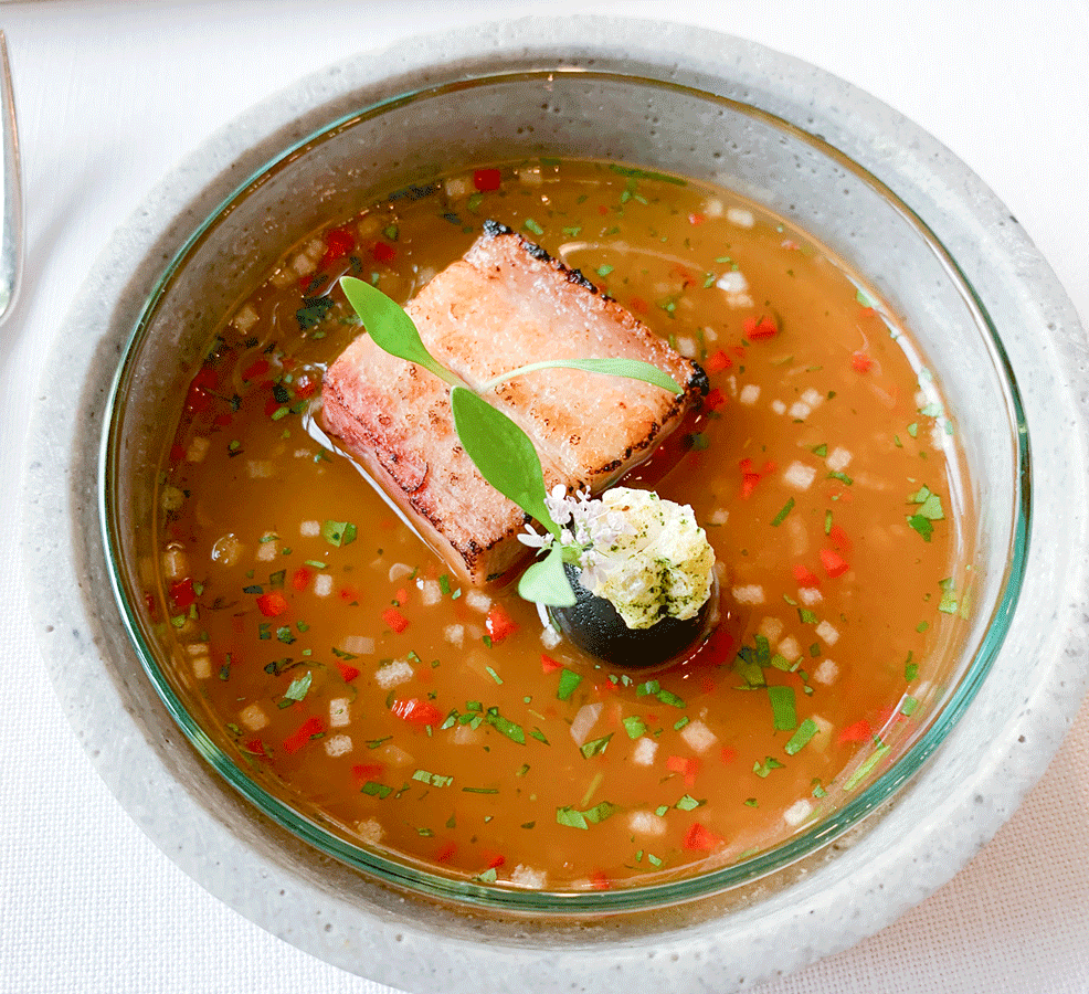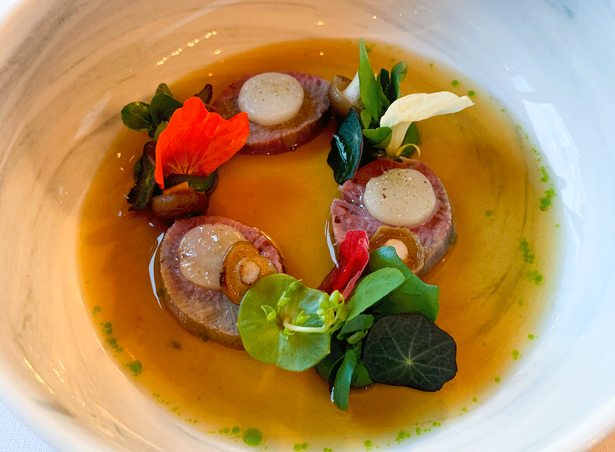 Ein Sud aus Ochsenbrust mit Brunnenkresseöl gibt diesem Gericht den entscheidenden Kick.