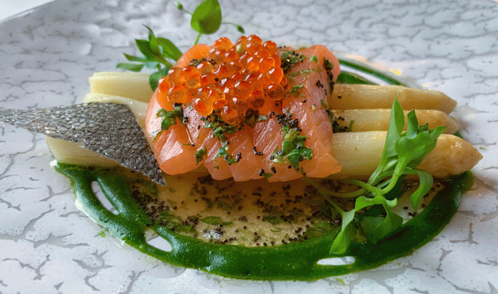 Regenbogenforelle Ike Jime, Spargel, Mohnvinaigrette, Vogelmiere