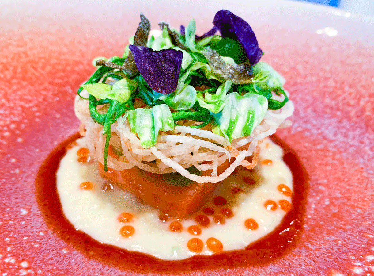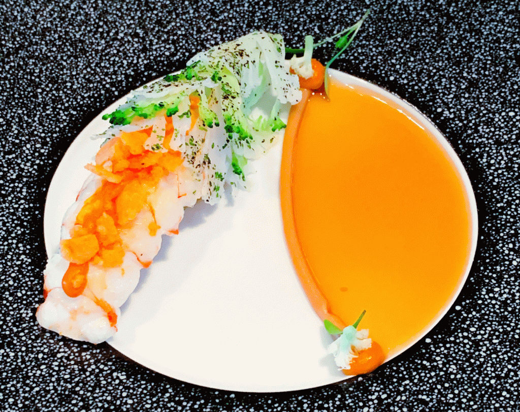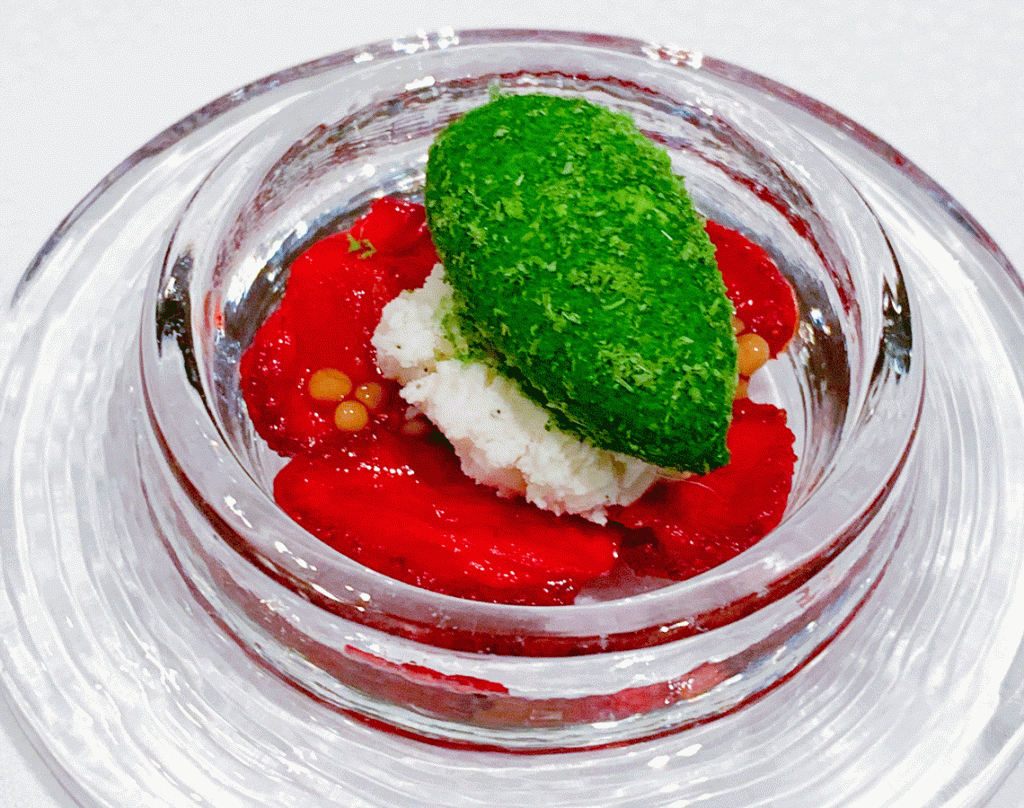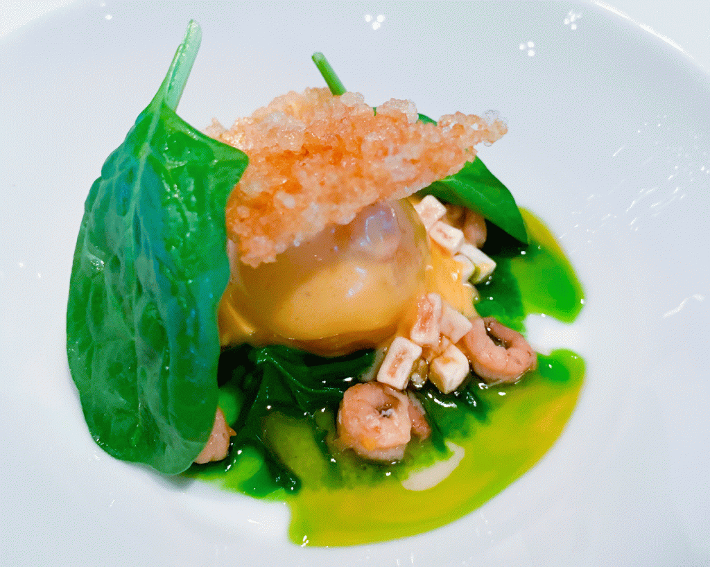 Unser Onsen-Eigelb „mariniert“ Nordseekrabben, Blattspinat & Piment Espelette