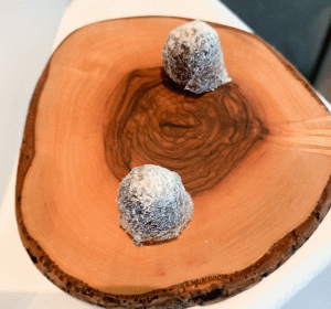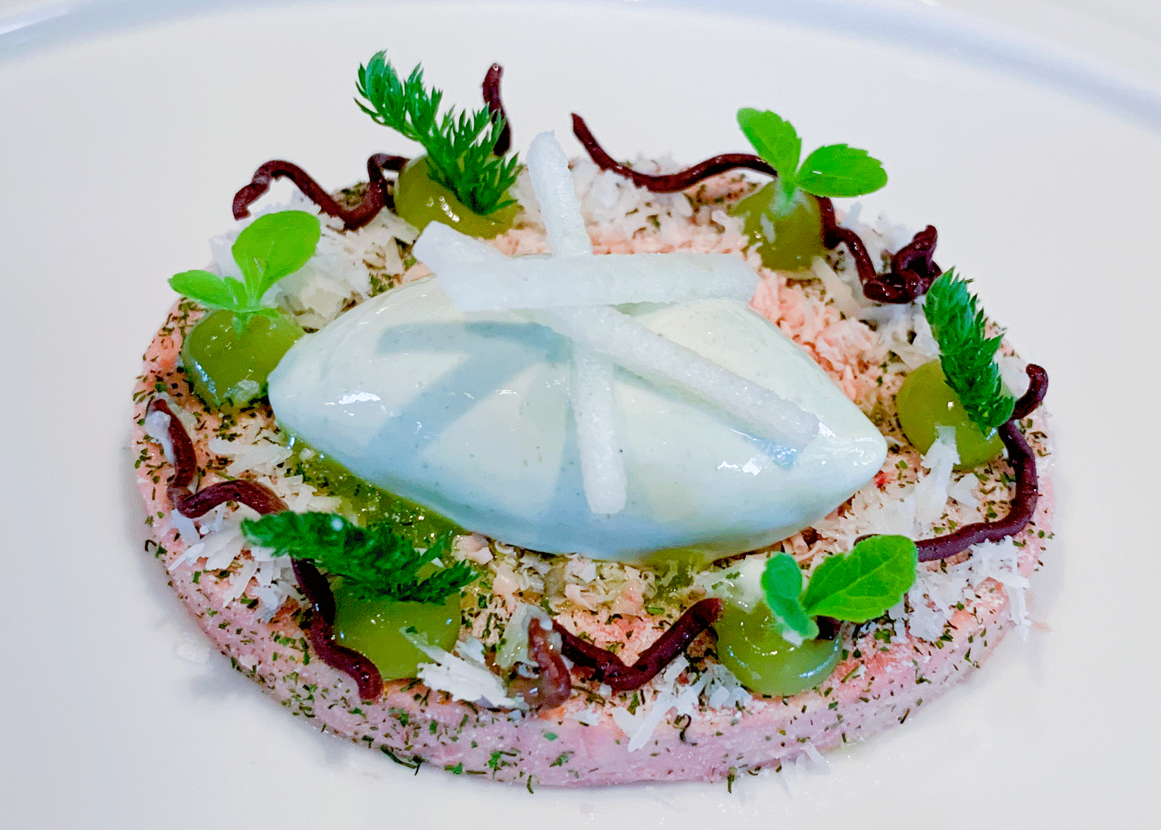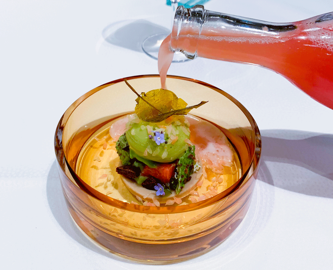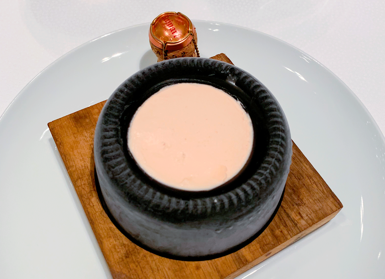 Das Champagner Cremesorbet ist ein Dauerbrenner in Elverfelds Küche und wird hervorragend in Szene gesetzt. Das Sorbet wird in einem Flaschenboden serviert, der sich auf einem Teil eines Champagner-Rüttelbrettes befindet.