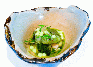 Das Onsenei hält sich nun schon eine lange Zeit in der Spitzenküche. Neben den Babyspinatblättern gibt es noch ein Hütchen aus ausgebackenem Eiweiß. Eine tolle Idee.
