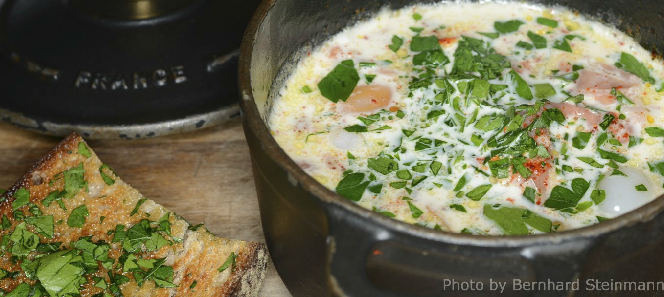 Zum Start gibt es Oeufs Cocotte mit Bayonner Schinken.