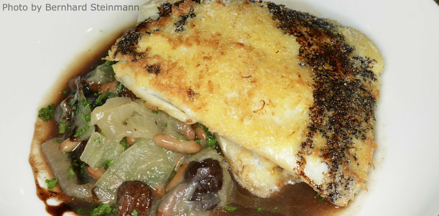 Kabeljau mit Zitronenkruste, Zwiebel-Pinienkerne, Rosinenragout.