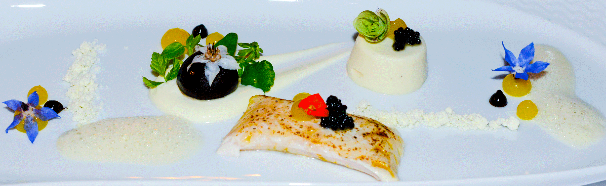 Ein kleines Stück abgeflämmter Stör, Störmousse, dazu eine Sphäre aus schwarzem Knoblauch, Crème fraîche und Bergamottetupfen
