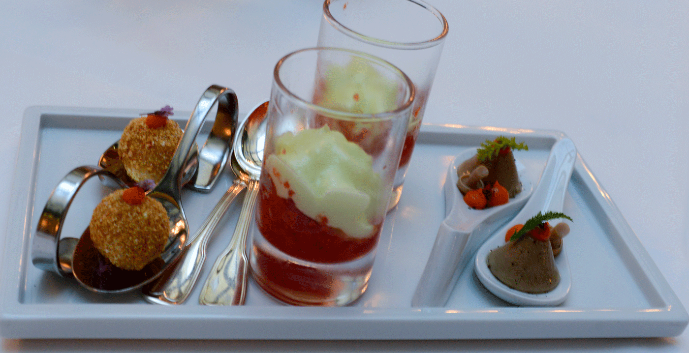 Wir suchen uns ein Menü aus, ändern es leicht ab und kurz darauf erreichen uns die ersten Amuse Gueules.