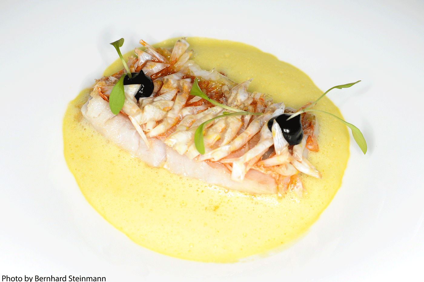 Das ausgezeichnete Rotbarbenfilet mit dem perfekt getroffenen Garpunkt erhält mit den knusprigen Schuppen nicht nur eine weitere Textur sondern eine Steigerung des Hochgenusses. Das Zusammenspiel mit Safran und Tomaten-Vinaigrette ist herausragend. Das feine Aroma des Fischleins wird durch die Zutaten umschmeichelt, nicht unterdrückt.