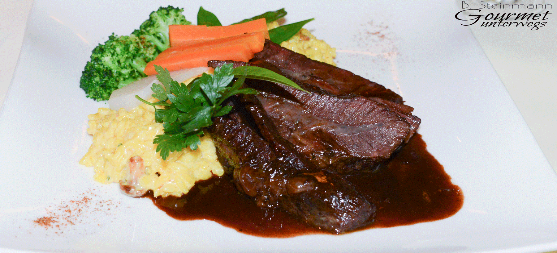 Geschmorte Bäckle von Schwarzwälder Weiderindern, kräftige Rinderjus, Safran-Risotto, Portweinjus, Gemüse vom Markt.