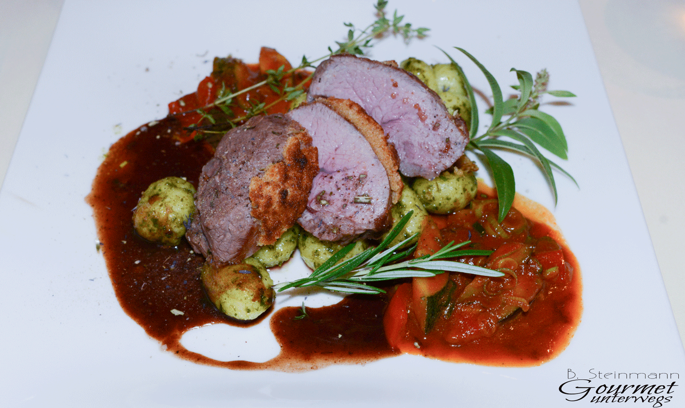 Hüftle vom Pommerschen Landschaf, Sommergemüse, Gnocchi mit Basilikum-Pesto, Iberico Schinken.