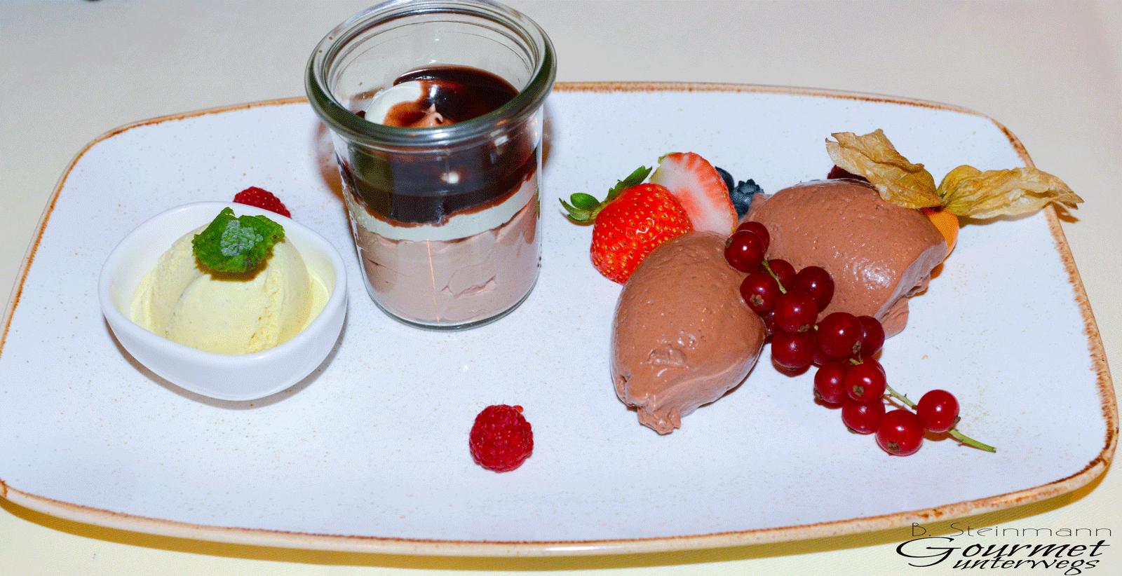 Mousse von Valhrona Schokolade 64% Manjari, Schokoladen Parfait, Bourbon Vanilleeis, Beeren.