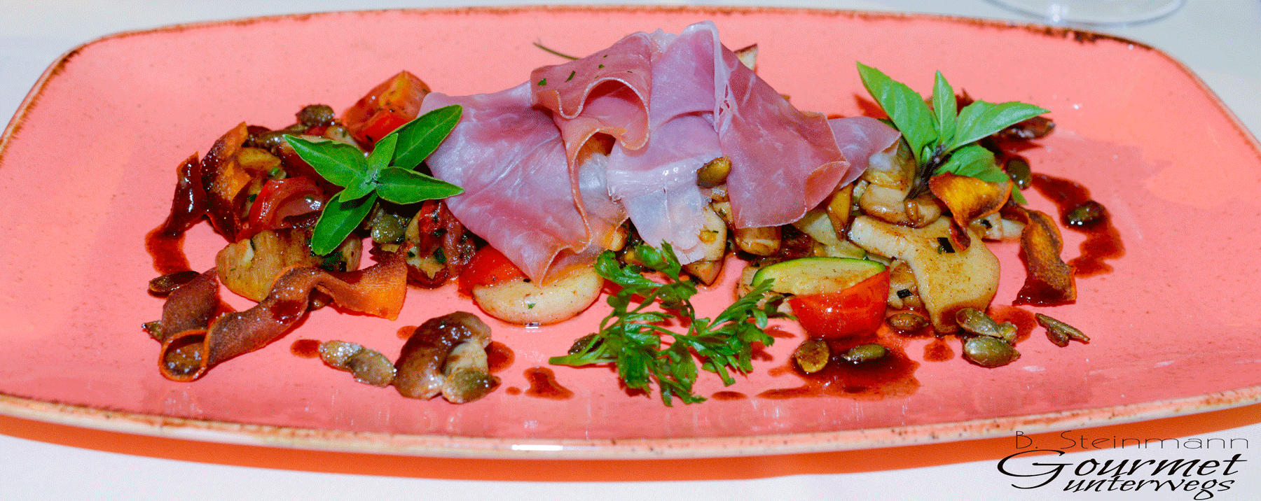 Sautierte frische Bayerische Steinpilze mit Kräutern, geröstete Kürbiskerne, hauchdünne Scheiben vom Alemannenschinken.