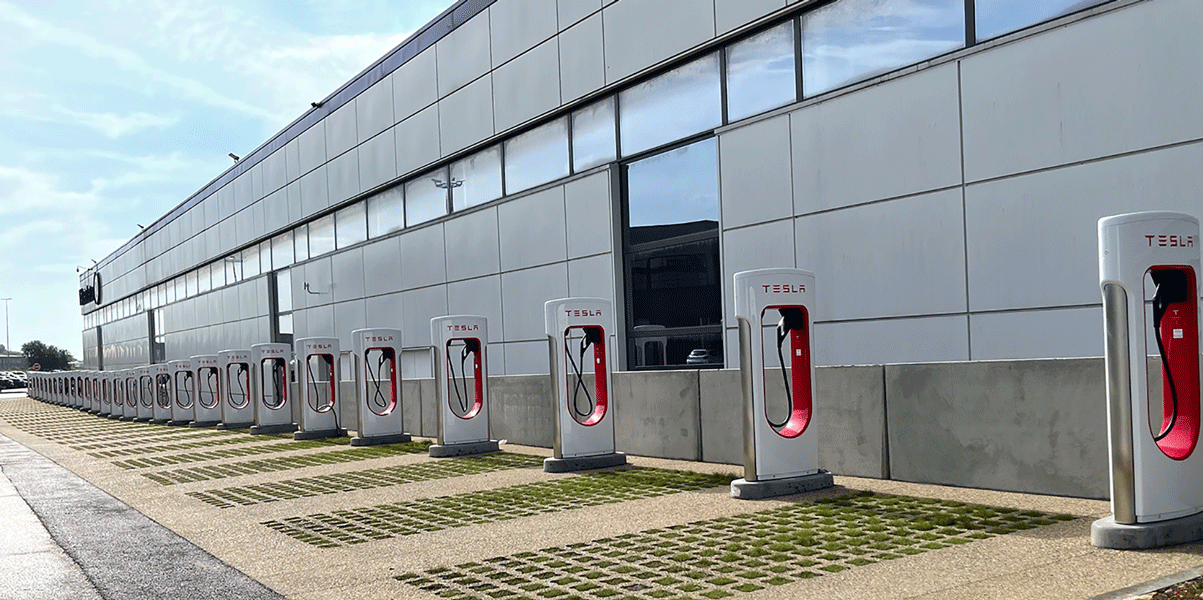 Tesla-Supercharger in Beaune (Frankreich). Geeignet für alle E-Fahrzeuge mit einem Combined Charging System (CCS) (Foto: Bernhard Steinmann)