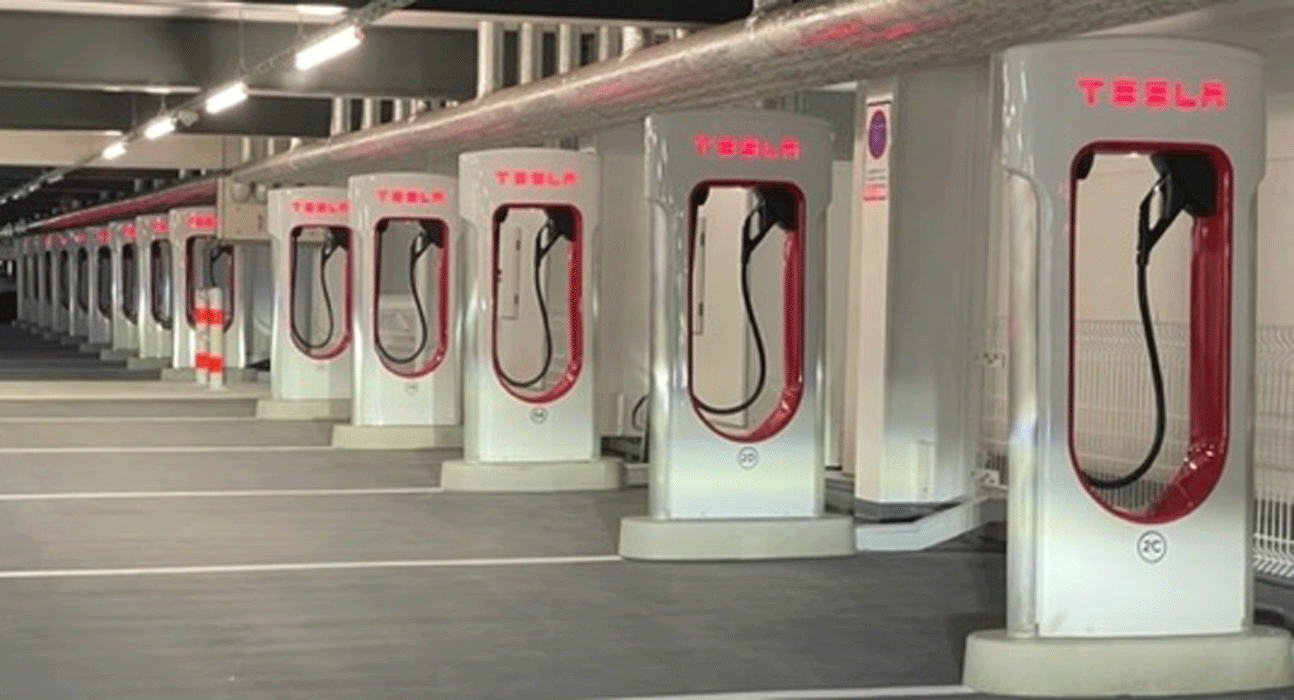 Prima für Regentage. Tesla-Supercharger im Parkhaus Gleisdreieck in Berlin. (Foto Bernhard Steinmann)