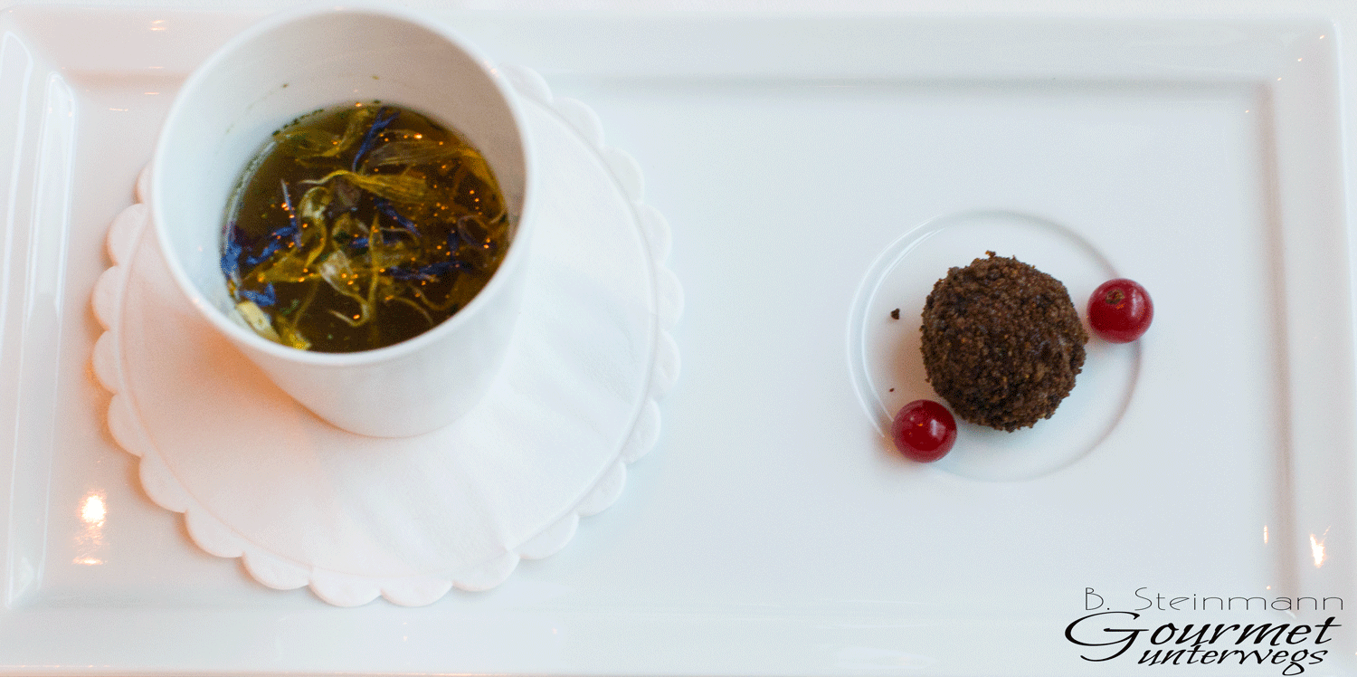Geflügelbrühe mit Bärlauch und floralen Noten, Kalbstatarkugel im Grünkernmantel, Johannisbeeren