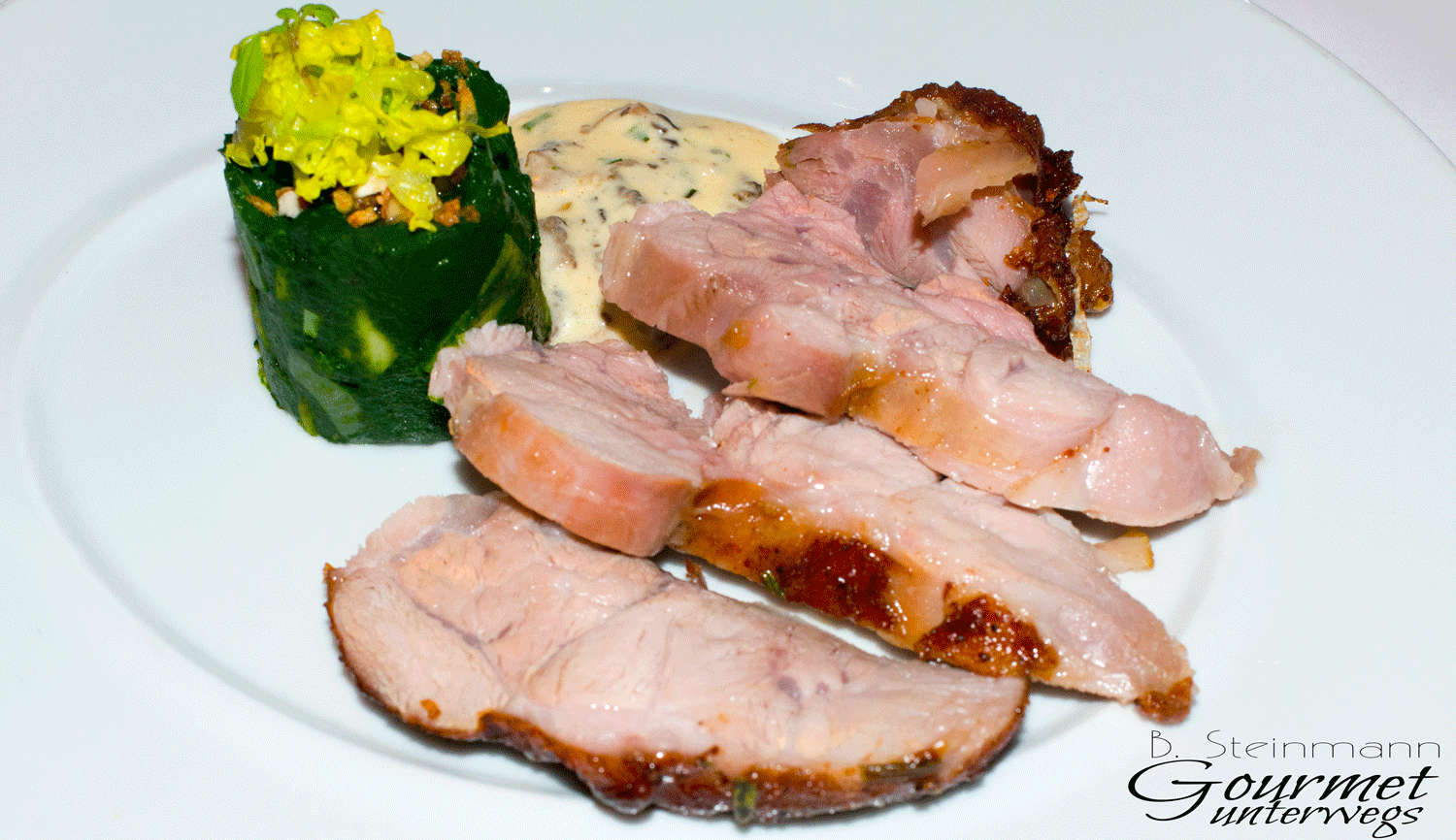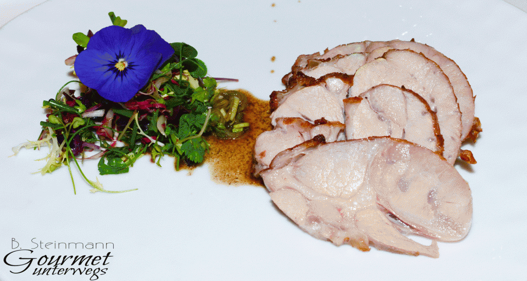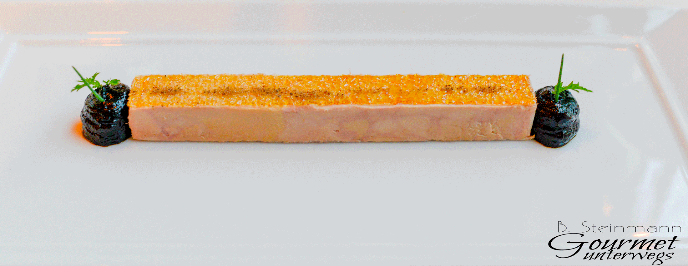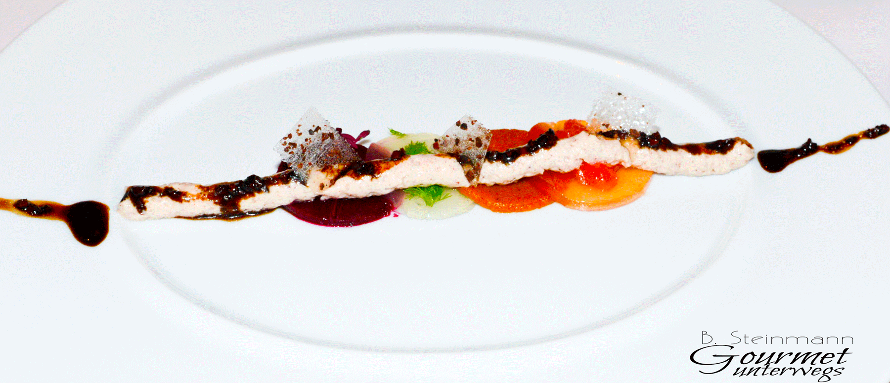 „Die knusprig glasierte, hauchdünne Decke Pfefferkaramell vollendete ein ohnehin schon außergewöhnlich geschmacksintensives Gericht, welches durch die an den Enden platzierte Auberginenkonfitüre ein geradezu futuristisches Aussehen bekam.“