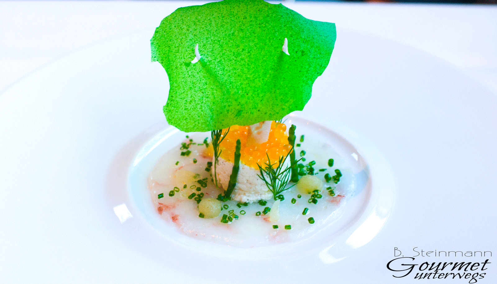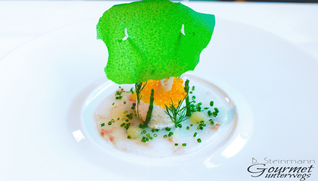 Das grüne Segel ist ein Chip aus Kartoffelpüree und Algensaft. Ein echter Hingucker, der geschmacklich recht gut gefiel.