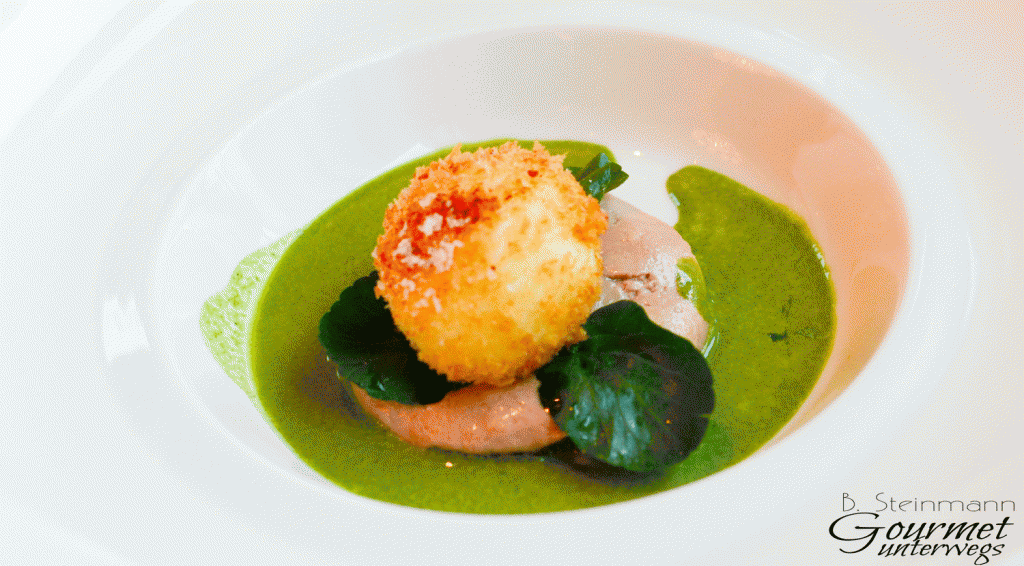 Keinesfalls einfach, sondern geschmacklich sehr gelungen, ist Lohses Gericht an diesem Abend. Gänsestopfleber und Brunnenkressecoulis passen vortrefflich zum Ei.