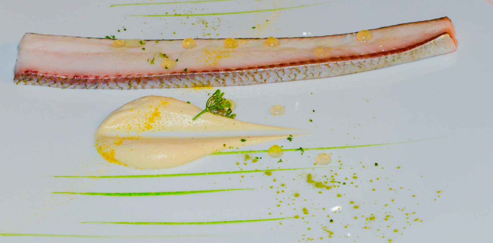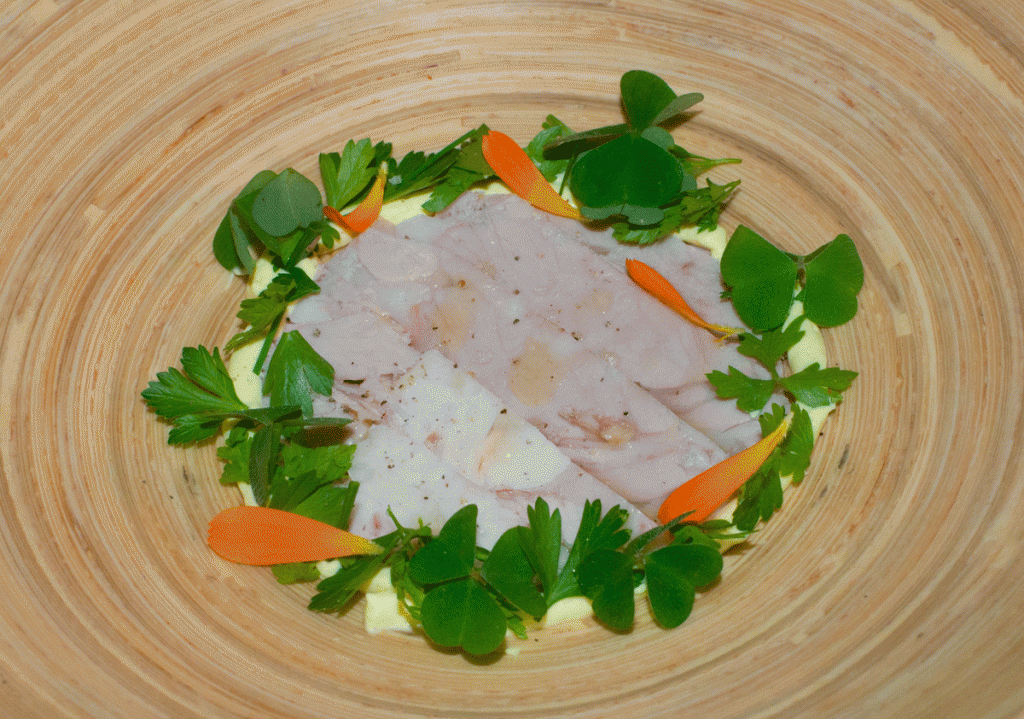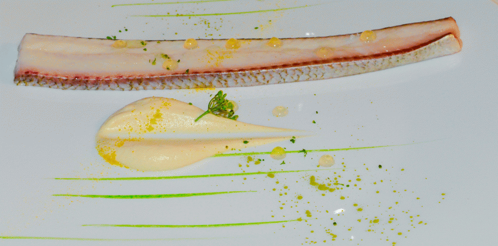 Besonders auffallend ist die zarte, fast cremige Textur des Fisches, präsentiert mit einem milden Limonendip.
