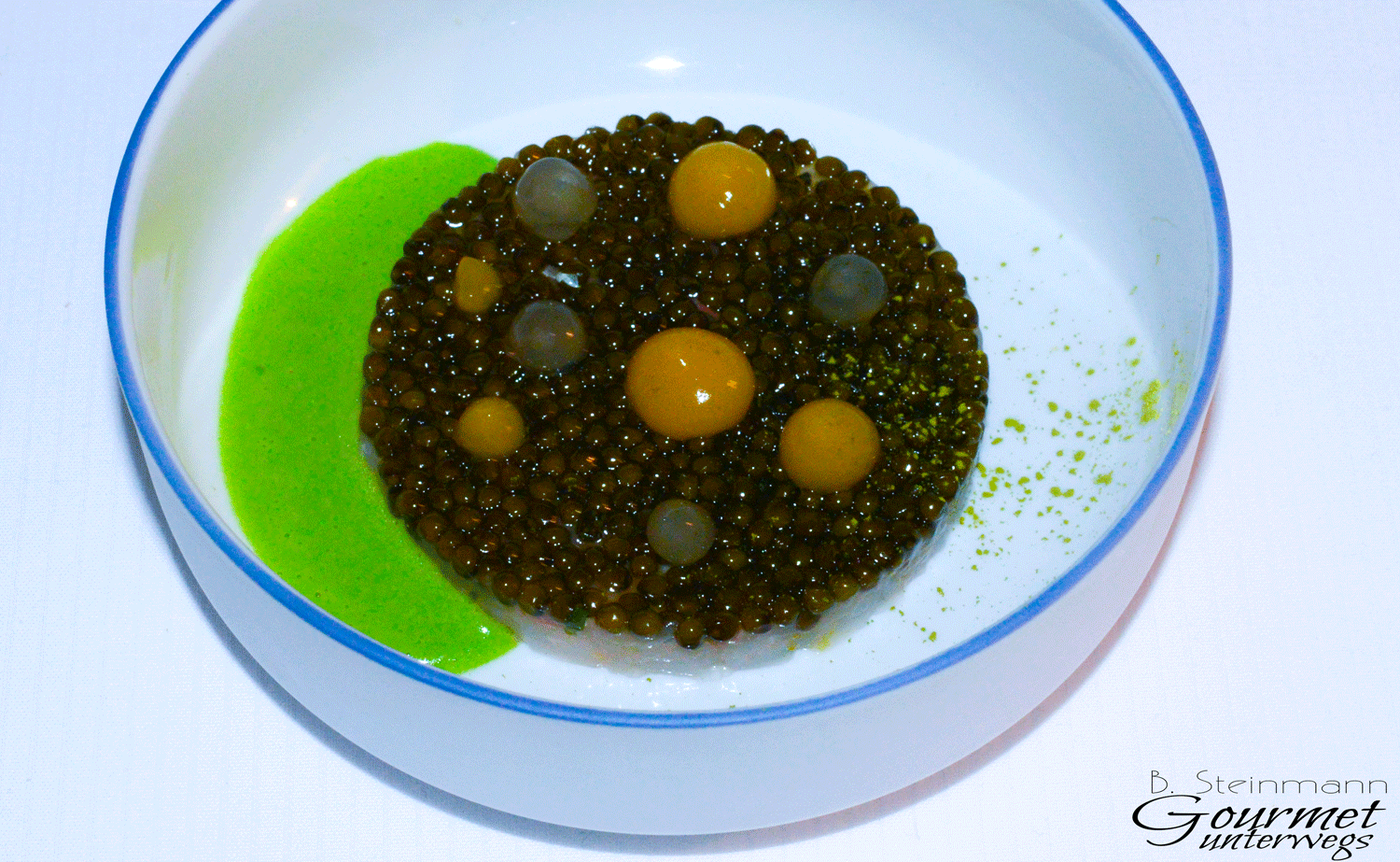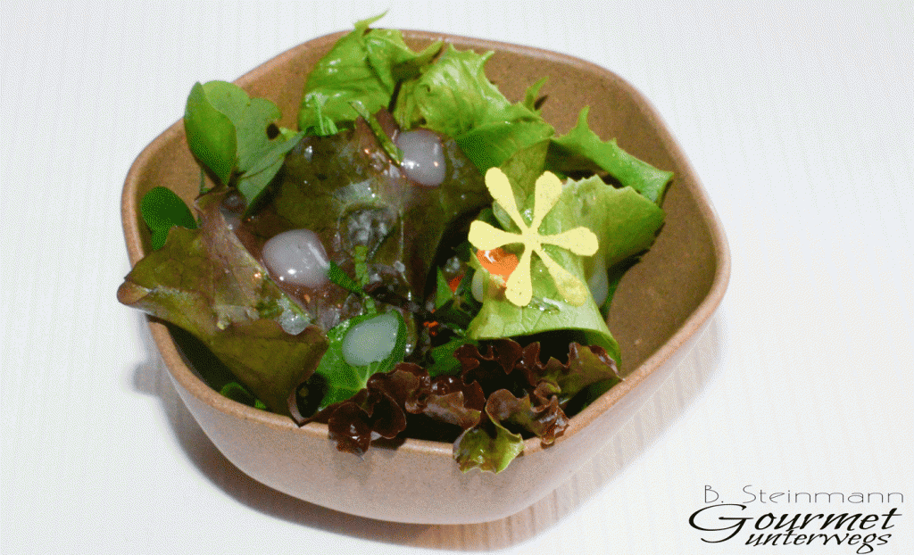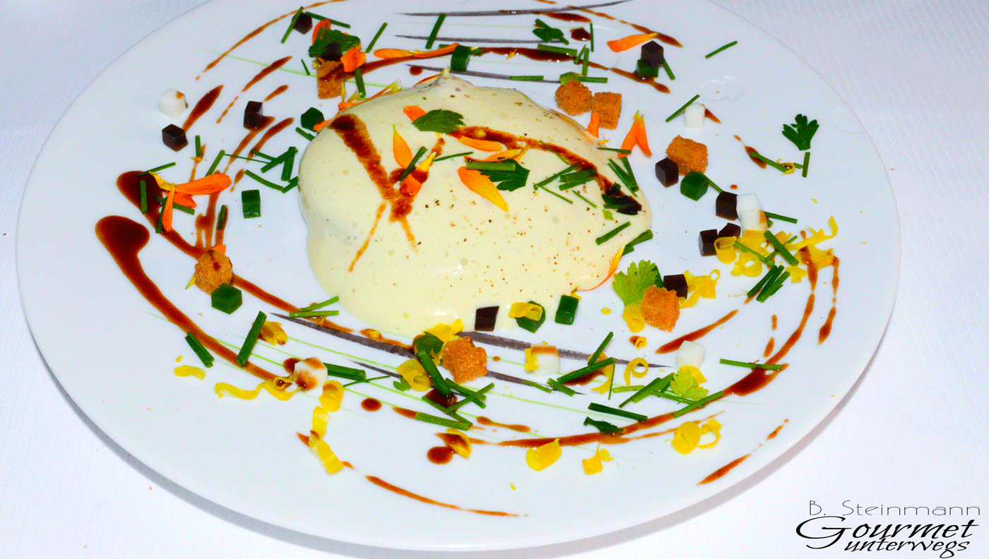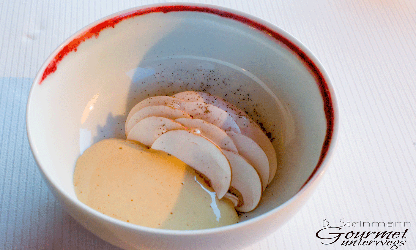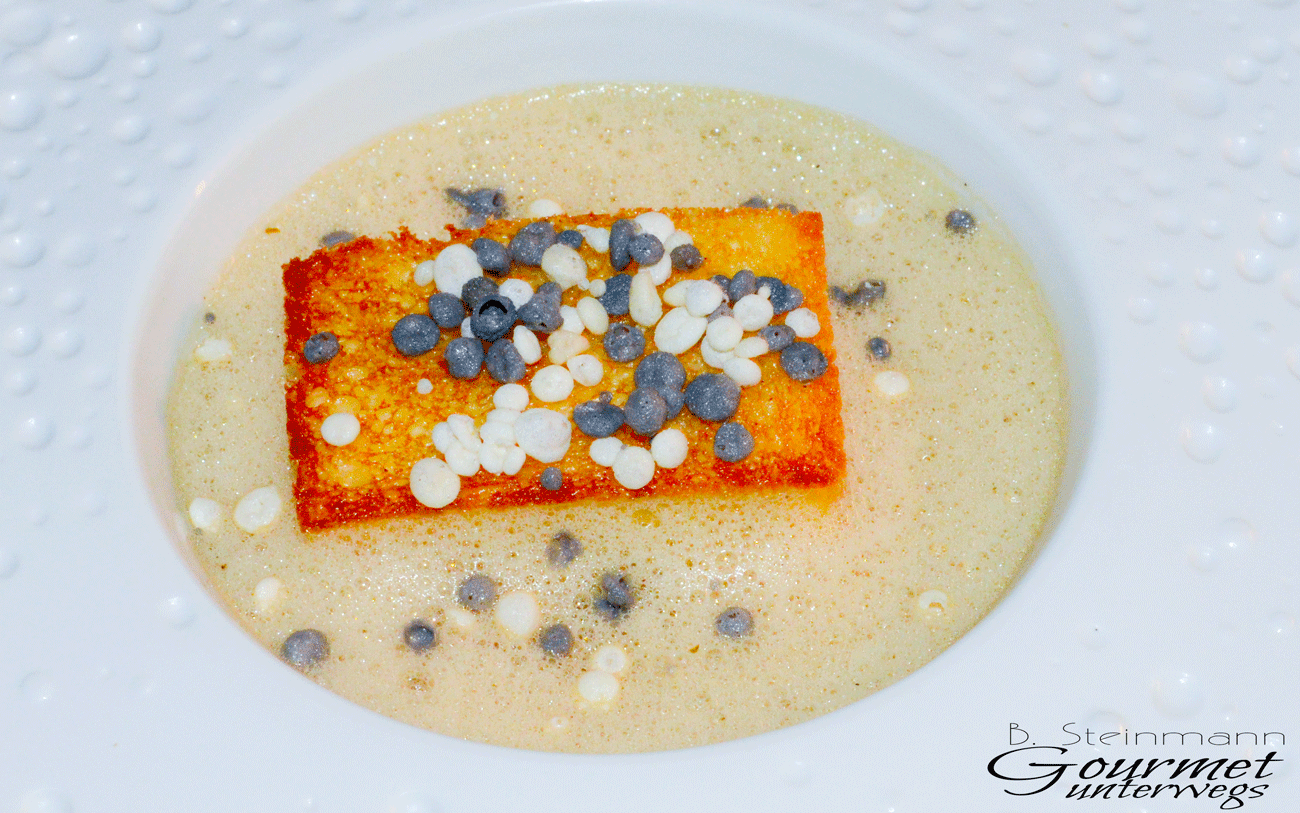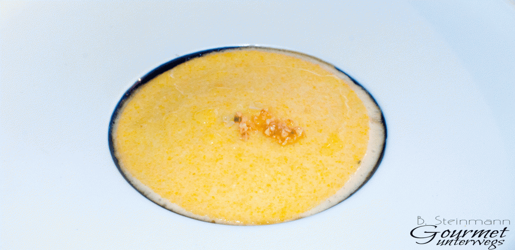 Die Amuse Gueules sind geschmacklich sehr fein ausbalancierte Kreationen, die am Gaumen schnell zu erfassen und zu identifizieren sind. Ein großes Plus, welches das Menü wie ein roter Faden durchzieht. Es ist für mich immer ein besonderes Vergnügen, wenn das Produkt im Mittelpunkt steht und nicht durch meist überflüssige Begleiter bis zur Unkenntlichkeit „verbessert“ wird.