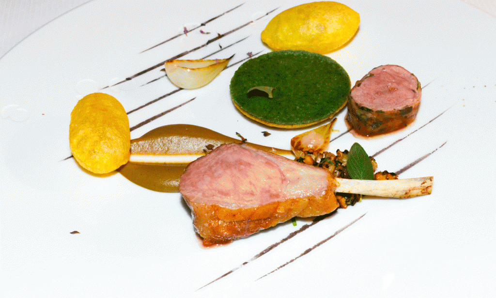 Lammrücken und Lammkeule aus Aveyron, frischer Knoblauch und Oregano, Zwiebeln und Champignons sowie eine kalt servierte Schulter mit Senf und natürlich Kräutern aus dem Garten.