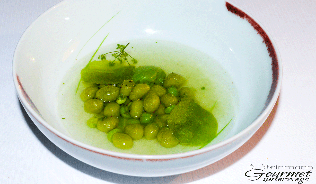 Ein toller Einfall. Wie der Beschreibung des Gerichtes zu entnehmen ist, fehlte der für Erbsen typisch mehlige Geschmack gänzlich. Ansonsten war das süßliche Erbsenaroma deutlich herausgearbeitet worden. Die restlichen Begleiter kamen, wie sollte es auch anders sein, aus dem Garten.