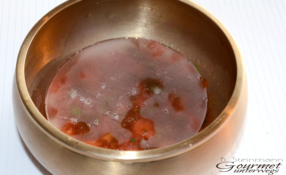 Sie alle kennen Tomaten und deren Geschmack. Bei diesem Gericht ist es allerdings etwas komplizierter. Diese Tomaten sind unglaublich zart und weich, schmackhaft von einer dezenten Würze umgarnt und durch die Kälte der Kreation nochmals geadelt. Falls ich jemals ein ähnlich grandioses Tomatenerlebnis hatte, muss ich in der Erinnerung zurück bis zu Jean-Georges Klein, der vor vielen Jahren damit ähnliche Emotionen ausgelöst hatte.