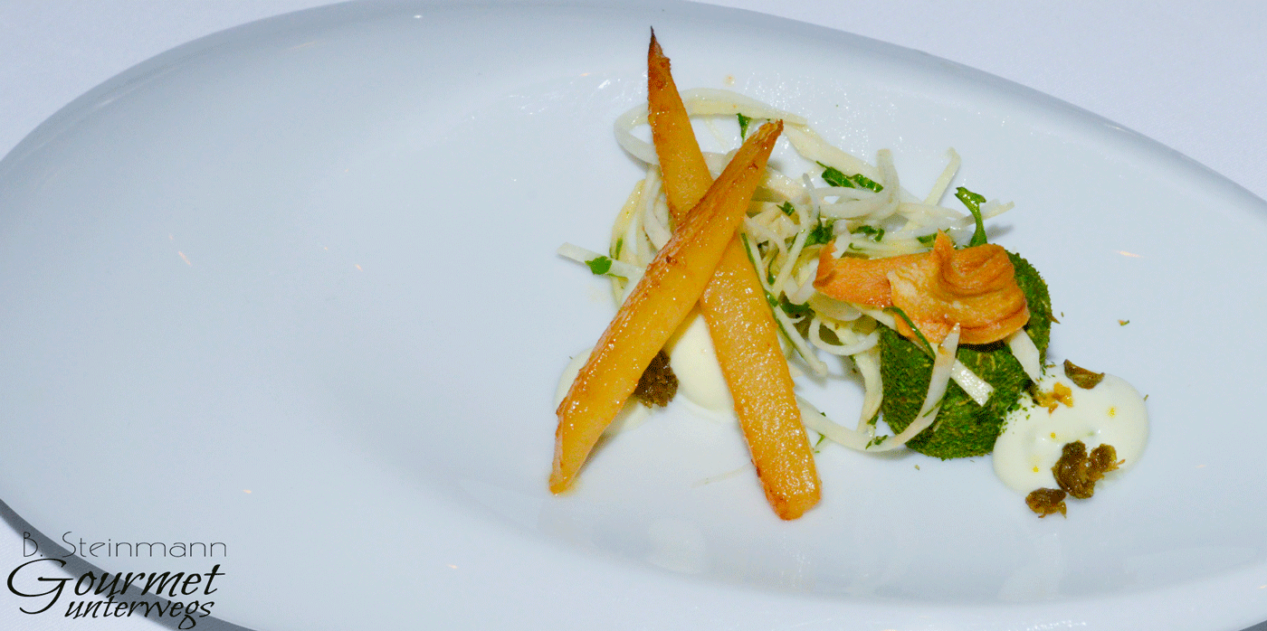 Nicht nur die Hauptkomponenten der Kreationen erfahren die notwendige Aufmerksamkeit, auch das Beiwerk findet entsprechende Beachtung und wird geschickt eingesetzt. So ergeben sich aromatische Geschmacksbilder, die selbst im Einsternebereich nicht alltäglich sind.