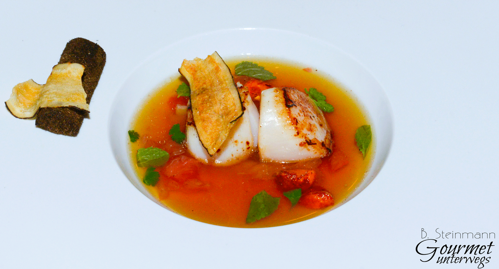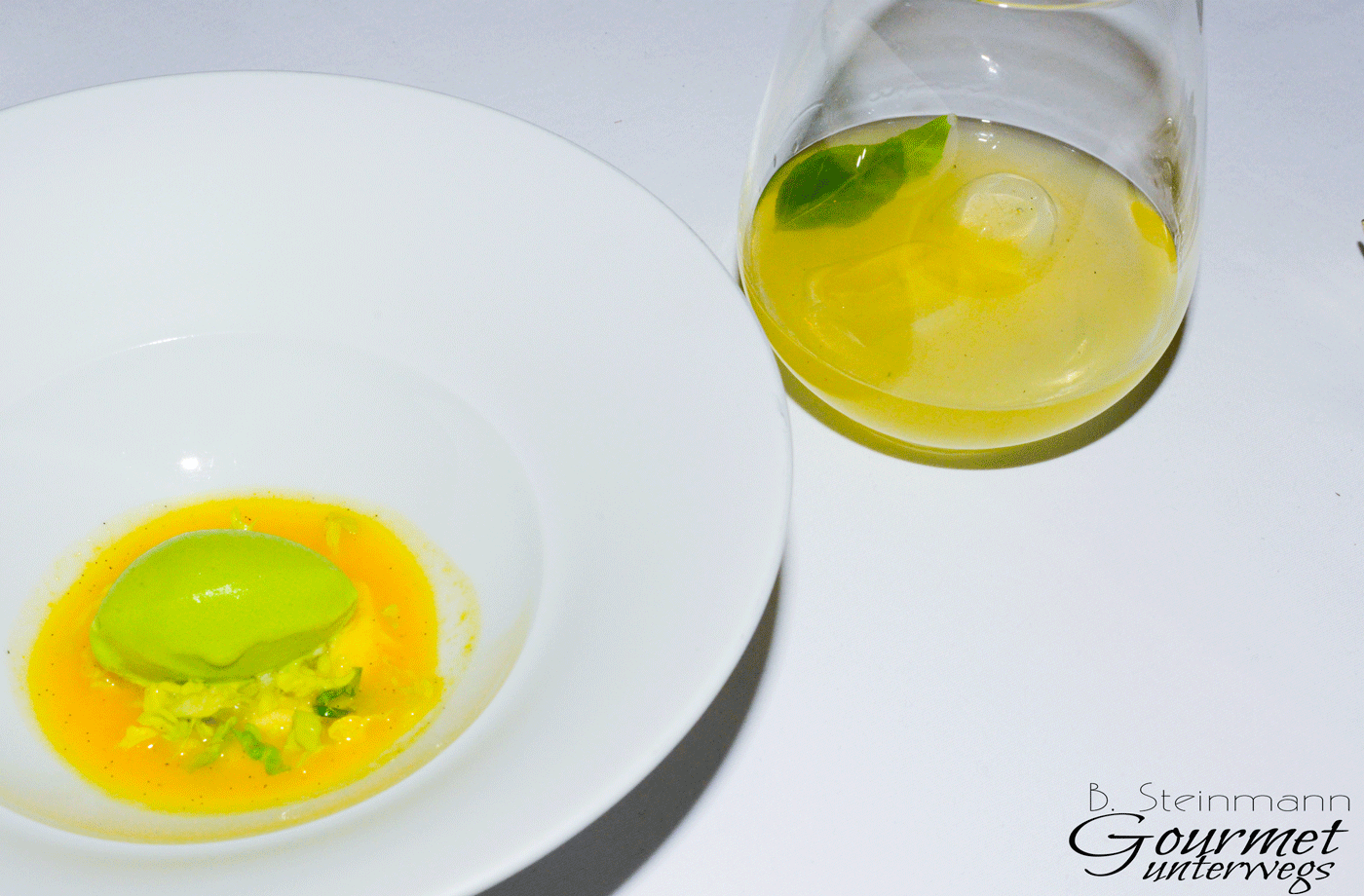 Der kleine Zwischengang mit seinen klar konstruierten Aromen, augenzwinkernd serviert, entpuppt sich als veritabler Glücksfall. Eine Kleinigkeit mit großer Wirkung. Fruchtig, erfrischend, einfach toll.