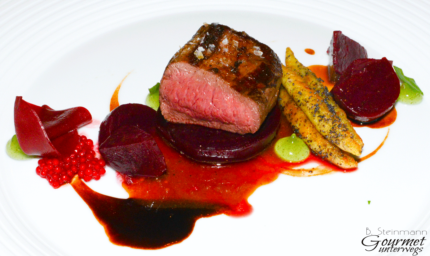 Beelitzer Hirschfilet, Rote Bete, Mohnschupfnudeln. Estragon, Süßholz