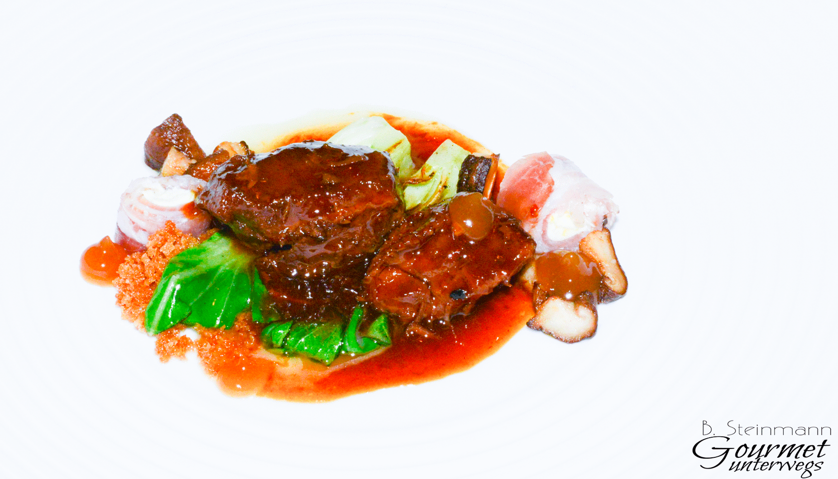 Schweinebäckchen, Pak Choi, Shi Take, Zitrone, Pancetta