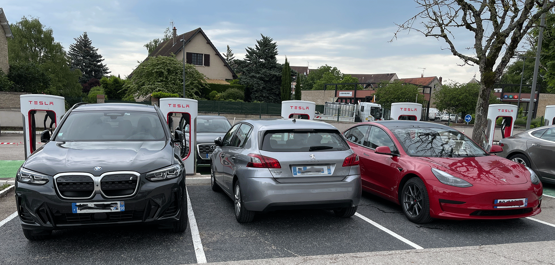 Auf dem Gelände des Hotels Mercure in Beaune gibt es einen Tesla Supercharger und wie man unschwer sehen kann, erkennen französische Verbrennerfahrer ebenso wie manch deutscher Kollege hier nur Parkplätze.