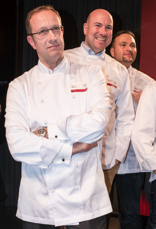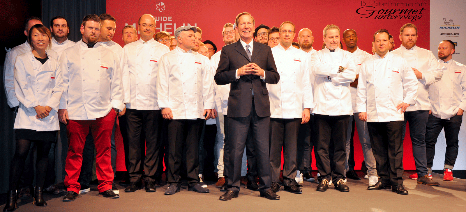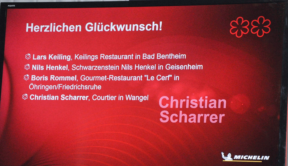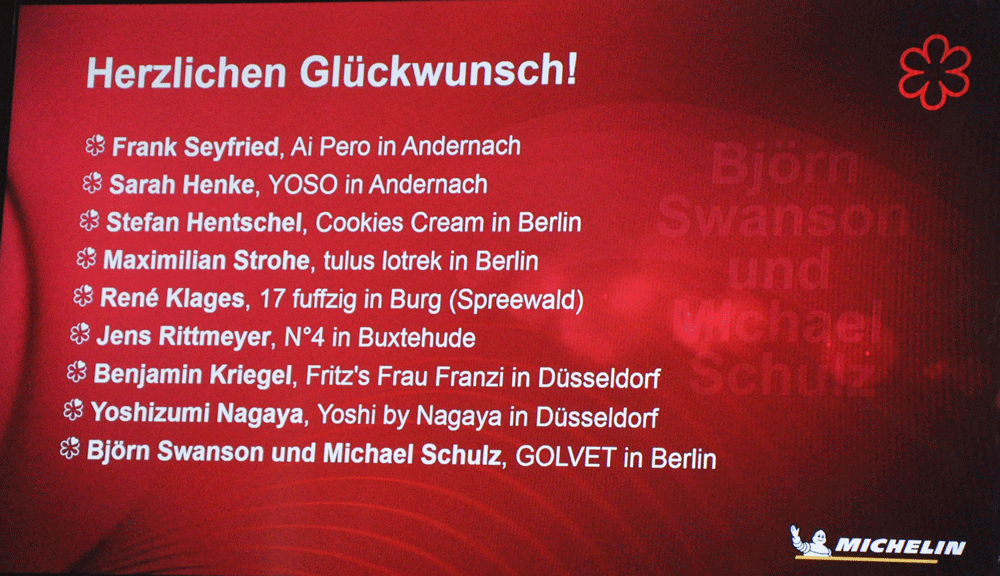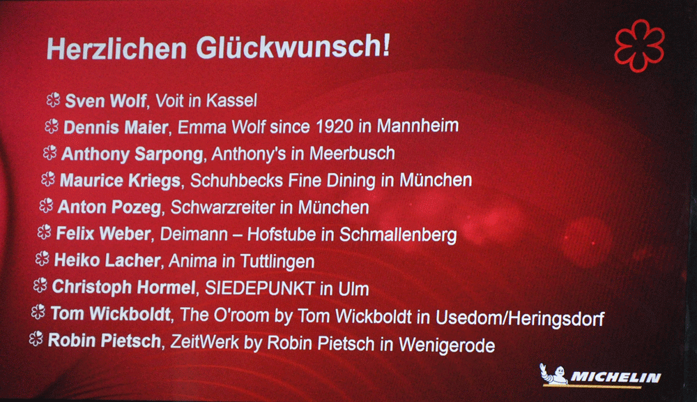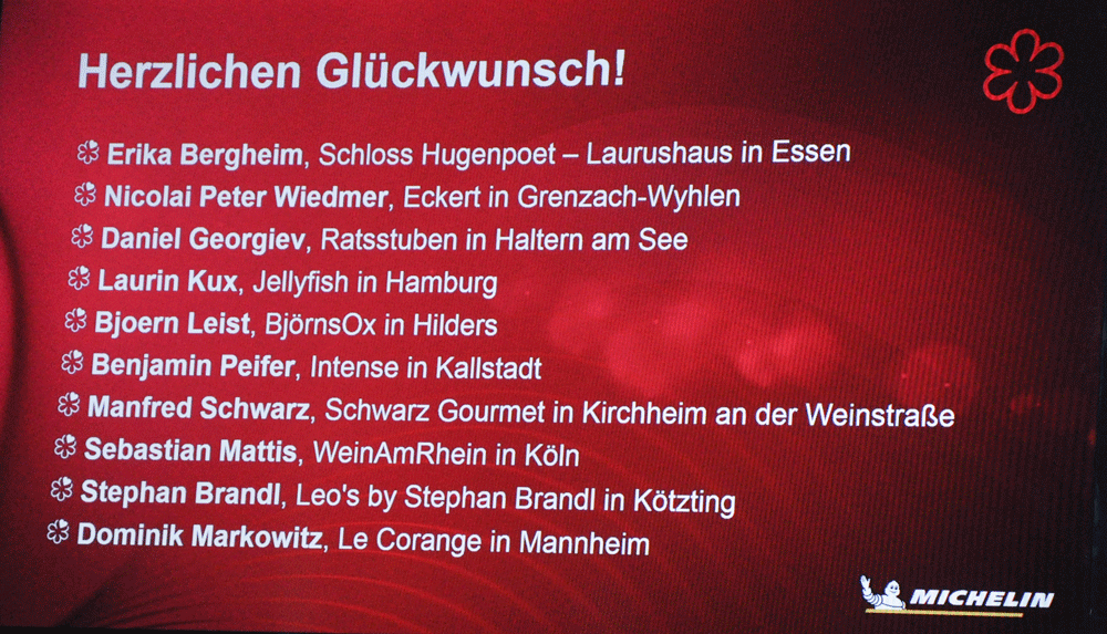 Vier neue 2-Sterne-Restaurants gab es ebenfalls zu feiern. Besonders erwähnen möchte ich gerne Nils Henkel, der im „Schwarzenstein“ in Geisenheim ein beeindruckendes Comeback feiert. Damit gibt es in Deutschland 39 Adressen mit zwei Michelinsternen.