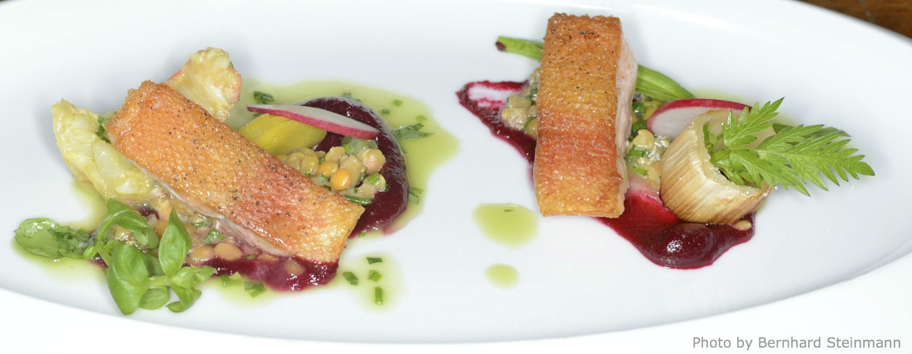 Goldforelle, geschmorter Lauch, Staudensellerie, Linsen, Rote Bete und Flusskrebs.