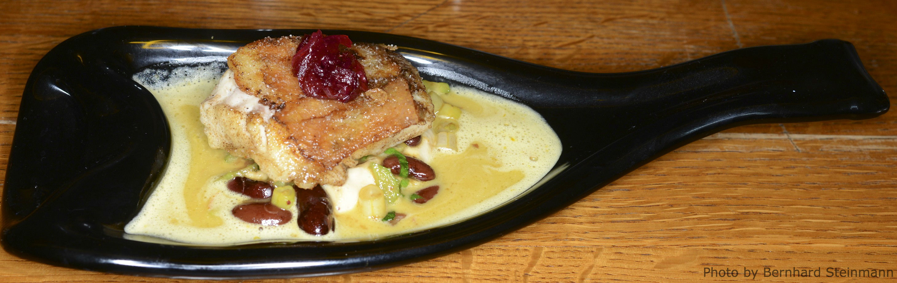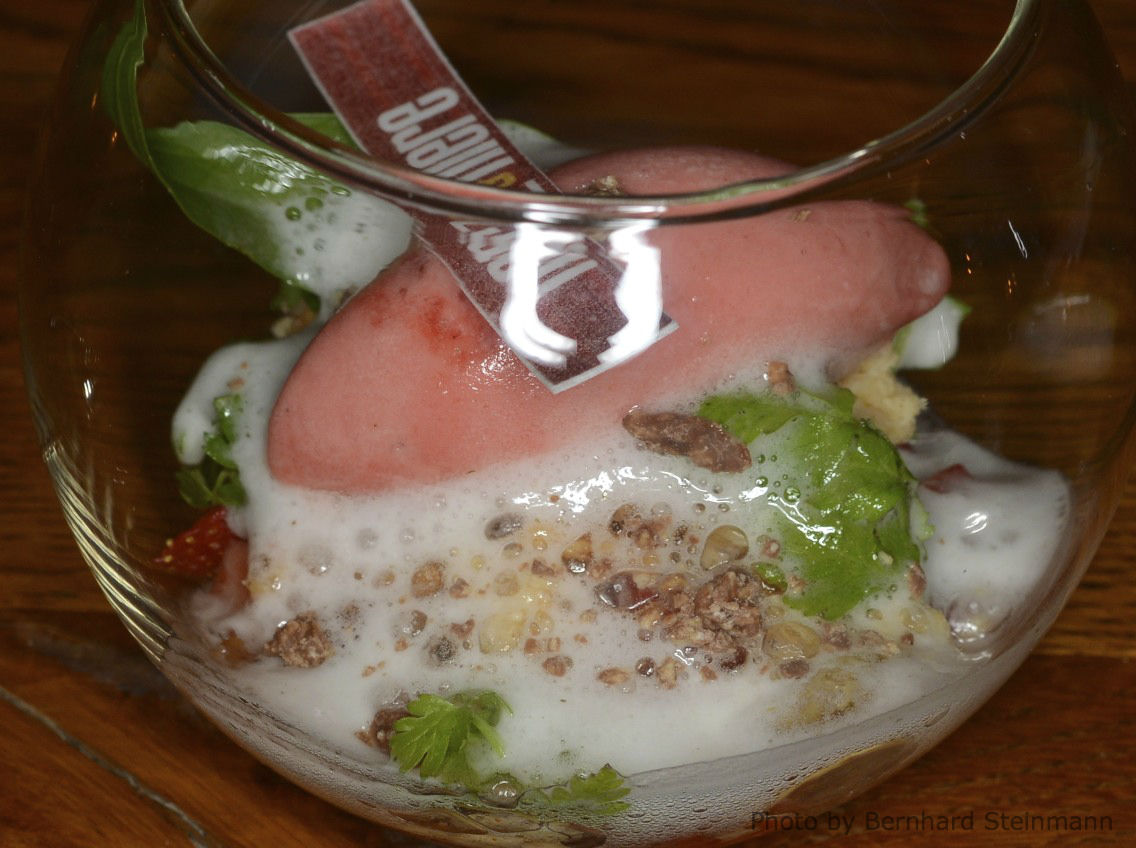 Das Aromenspektrum verbreitert sich im Laufe des Menüs. Zur dezenten Säure findet sich nun noch eine sehr gute fruchtige Note ein. Ein schöner Kontrast.