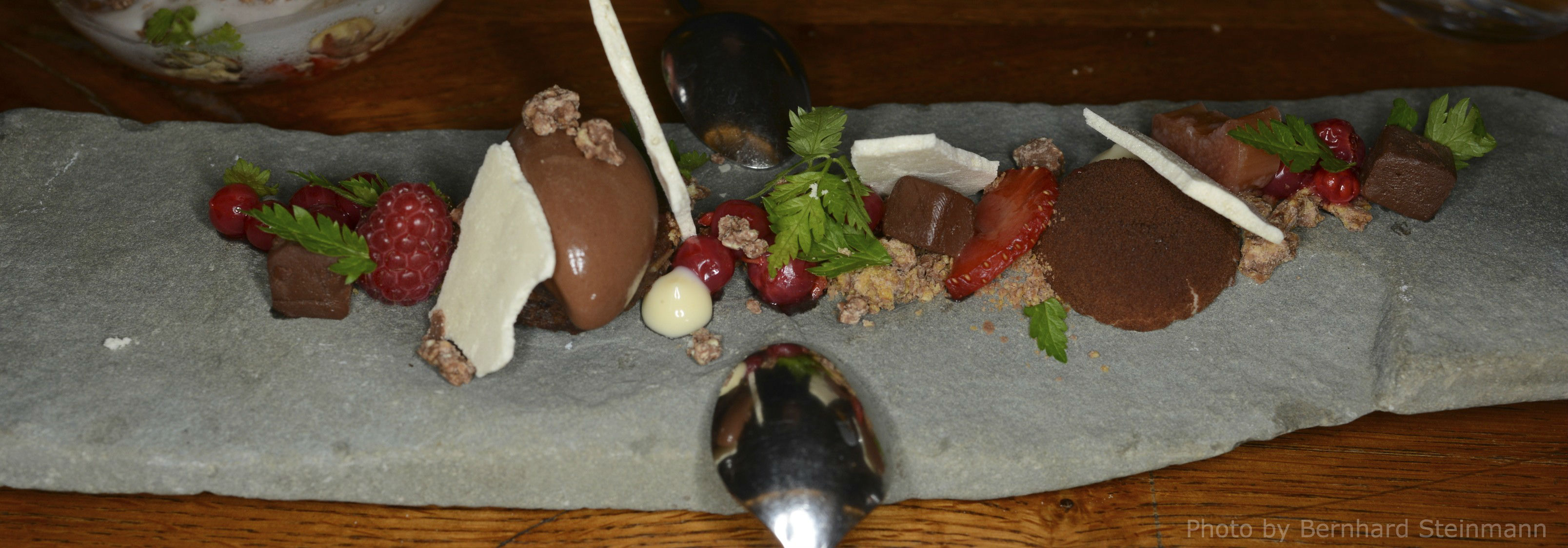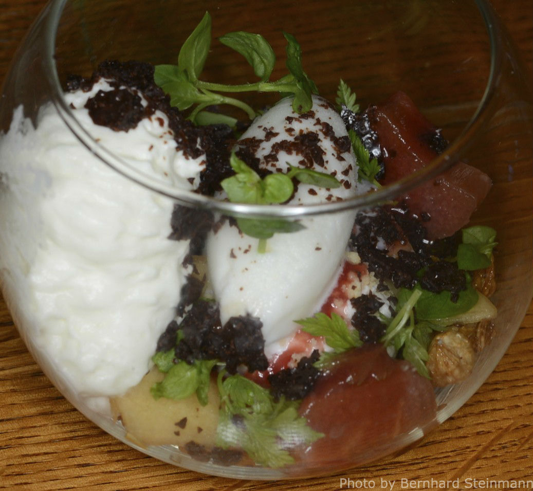 Christoph Hauser zeigte handwerkliches Geschick, vor allen Dingen jedoch Kreativität und eine erstaunliche Leichtigkeit bei der Zubereitung der Speisen. Er kombiniert sicher, bewegt sich nicht auf ausgetretenen Pfaden, experimentiert aber zurückhaltend. Von dem gezeigten Niveau waren wir mehr als angetan.