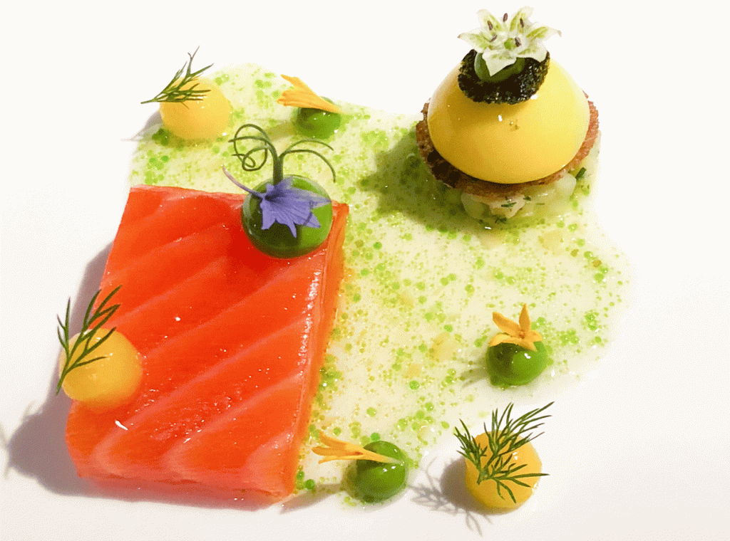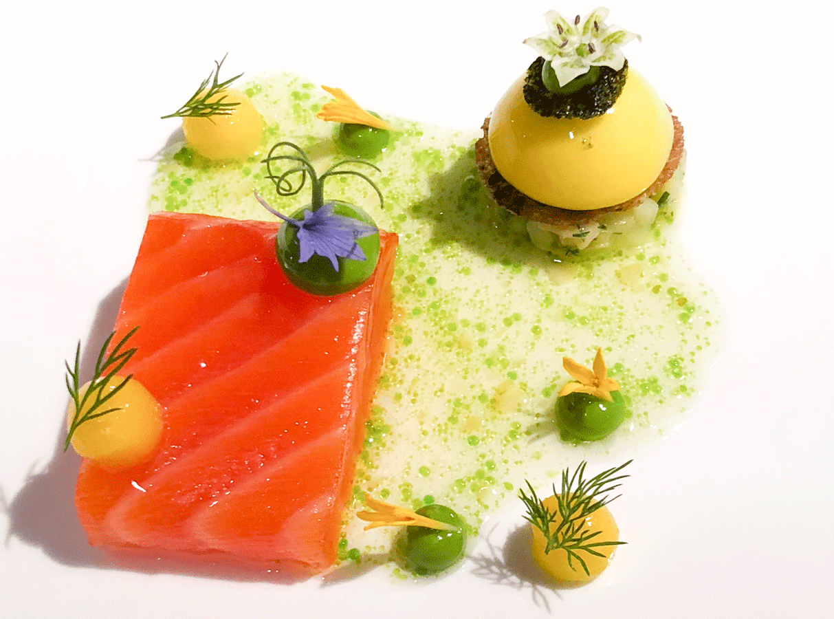 Loch Duart Lachs, Gurke, Macadamia, Sauerrahm, Mango & Dill von Jan Hartwig, Restaurant Atelier, München.