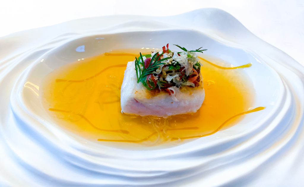 Gebratener Atlantik Merluza mit roh mariniertem Fenchel, Meeressalat und Wacholder-Aufguss von Thomas Schanz, Piesport.