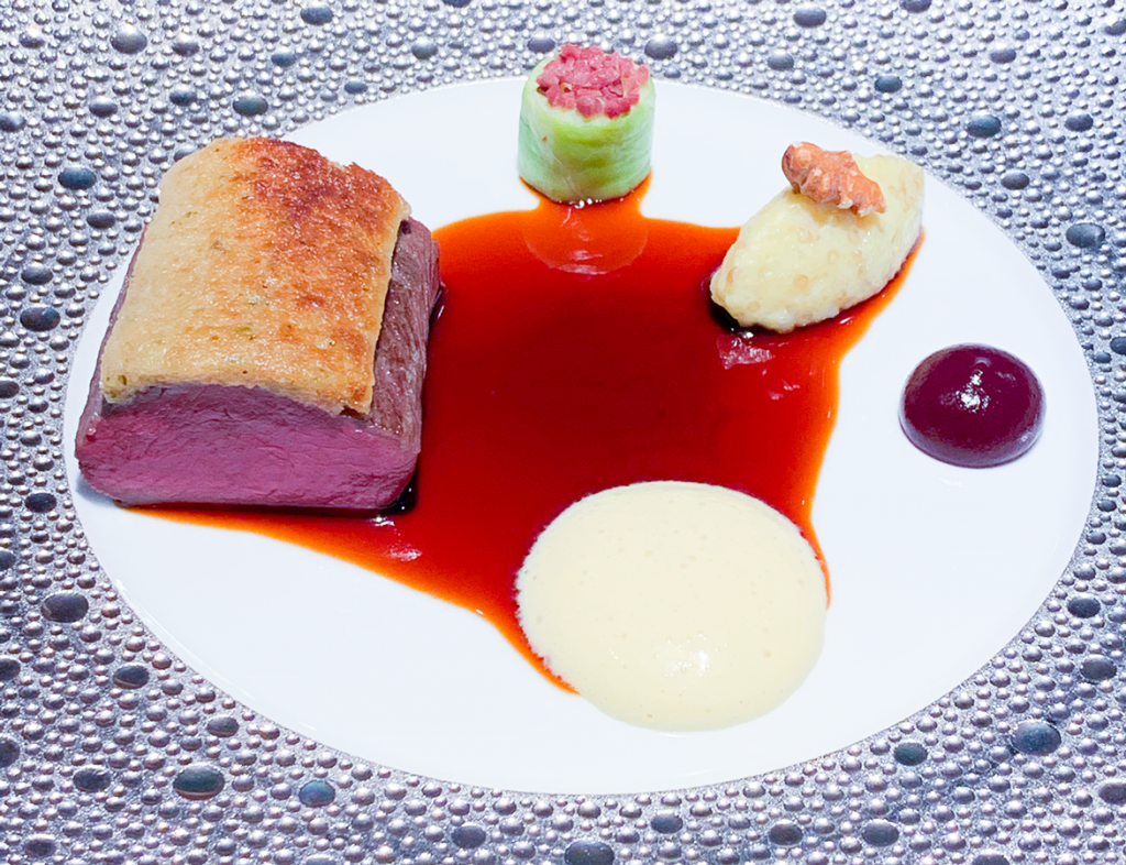 Rehrücken mit Walnuss-Pfefferkruste,fermentierte Blaubeeren, Sherryessig-Hollandaise und Rosmarinjus von Kevin Fehling, Table, Hamburg.