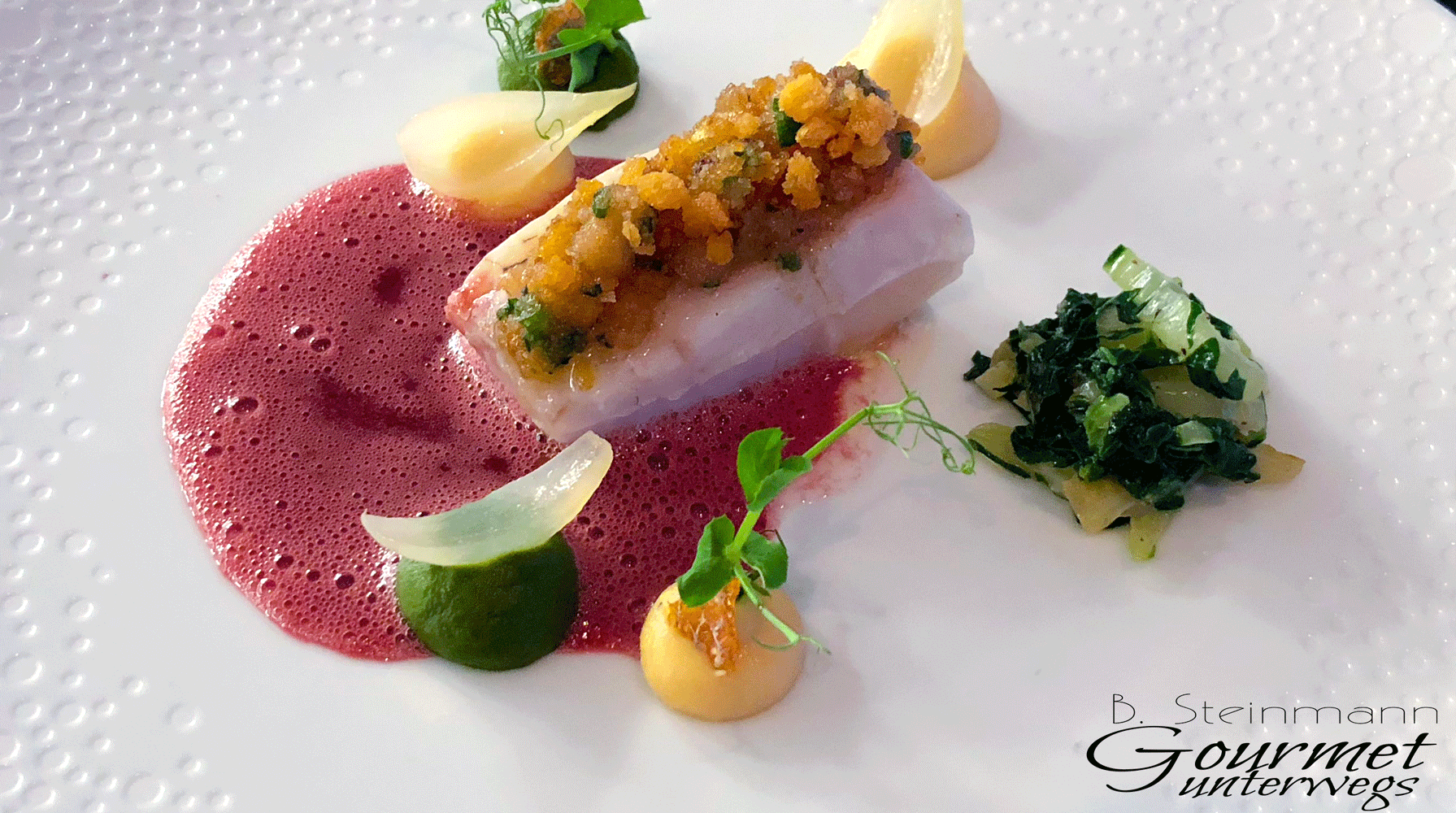 Zander a la Bordelaise, gratiniert, Beurre Rouge, Mangold, Petersilienwurzel von Alexander Hohlwein, Restaurant 360 Grad, Limburg.