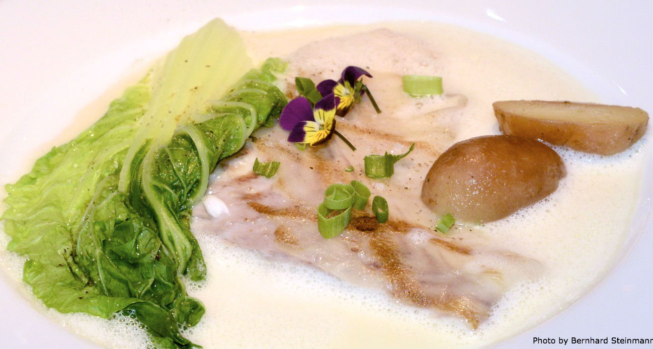 (Der Steinbutt, der zum Beginn des Abends den Gästen noch in seiner ganzen Größe zur Bewunderung präsentiert wurde, kam mit perfekt getroffenem Garpunkt auf den Teller. Ein Hauch Fleur de sel, geräucherte Kartoffel, Frühlingszwiebeln und eine vortreffliche Weinsauce verzauberten diesen Gang.)