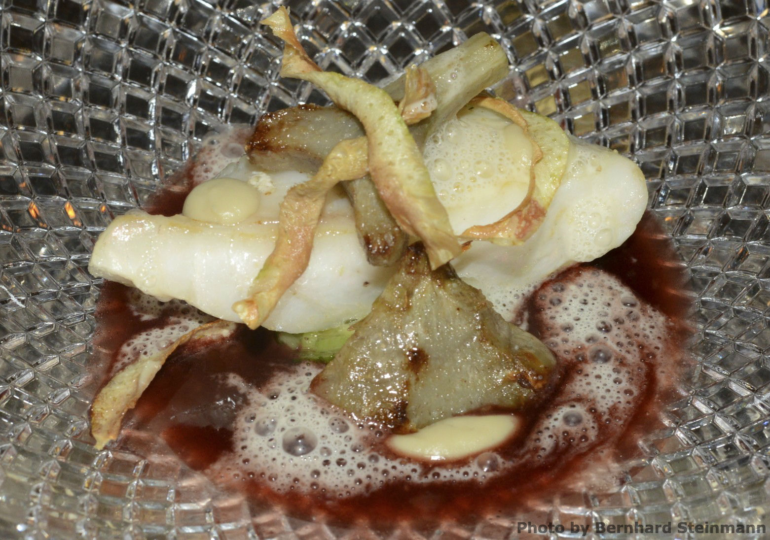 (Letzlich war es die Rotweinbutter, die mit außergewöhnlichem Geschmack, diesen Gang zu etwas Besonderem machte. Michael Fell erwähnte im Gespräch, die Idee von Alain Chapel übernommen zu haben.)