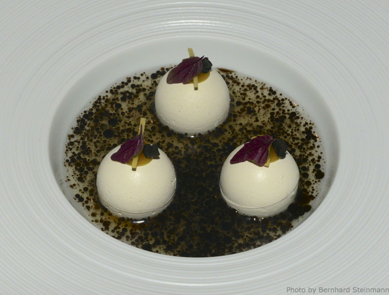 (Die Textur der Kügelchen war von zartem Schmelz. Besonders eindrucksvoll empfand ich die Verbindung salzig-fruchtiger Noten mit leicht säuerlichem Einschlag. Eine nahezu perfekte Balance zwischen den einzelnen Komponenten. Hohe Kreativität und handwerkliche Perfektion zeichnen die Küche nicht nur bei diesem Gericht aus.