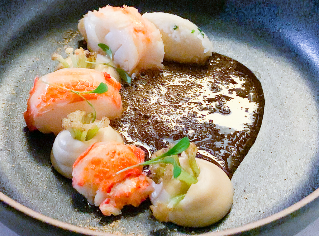 Blumenkohl ist eine in Deutschland sehr beliebte Gemüsesorte, da er sehr vielseitig einsetzbar ist. Die Koalition mit Hummer klingt daher nur auf den ersten Blick gewagt, tatsächlich ergibt dies jedoch eine sehr stimmige Kombination. Blumenkohlpüree und abgeflämmte Blumenkohlröschen gefallen uns besonders gut. Ergänzt wird das Gericht mit leicht thailändischem Einflüssen.