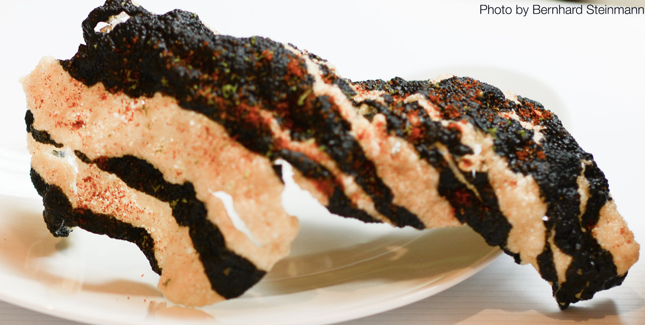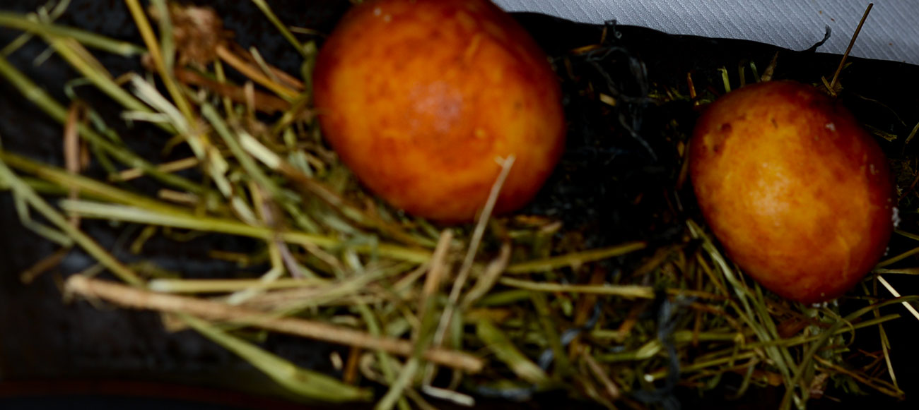 Hinzu kommen Kartoffeln, Rettich und Wasabi, damit das Ganze etwas aufgepeppt wird. Ganz gut gemacht, handwerklich einwandfrei. Das Fleisch wird im Heu geräuchert und um dies zu verdeutlichen, werden Croquettes auf verbranntem Heu serviert.