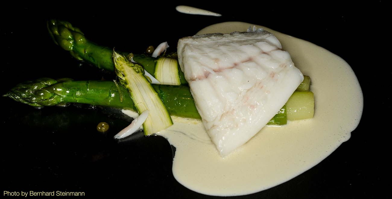Der aus dem Nordatlantik stammende Steinbutt wird mit grünem Spargel aus Avignon serviert. Vielleicht geht an dieser Stelle die Phantasie mit mir durch, doch der Umriss des Gerichts gleicht auffallend dem Umriss eines Steinbutts. Finden Sie nicht?