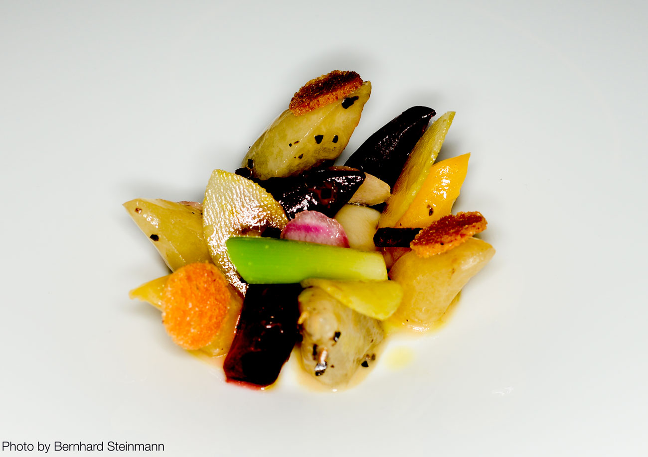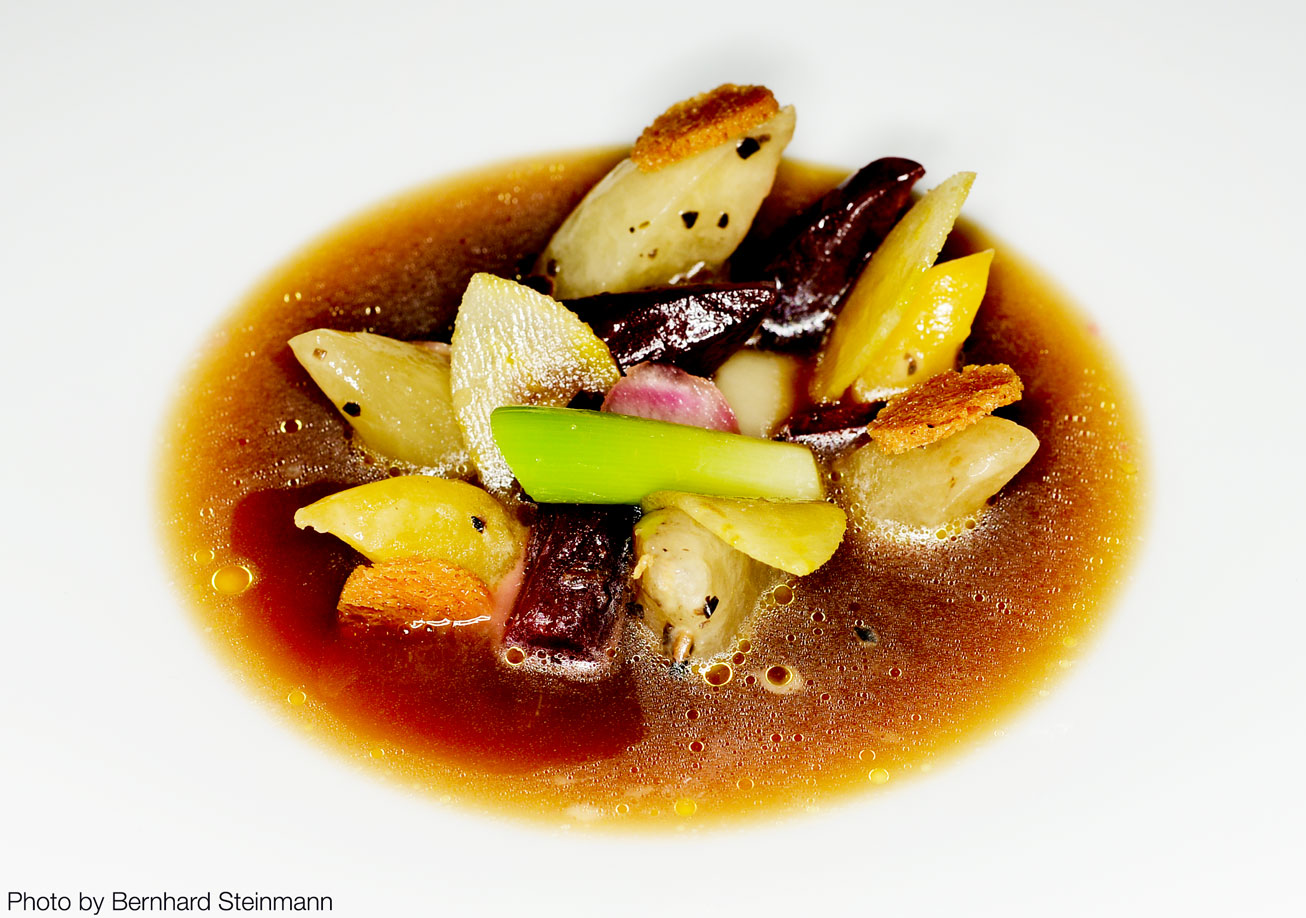 In einem zweiten Service wird eine Gemüse-Zwiebel-Brühe angegossen die mit großer Intensität, aromatisch und elegant das knackige Gemüse verfeinert.