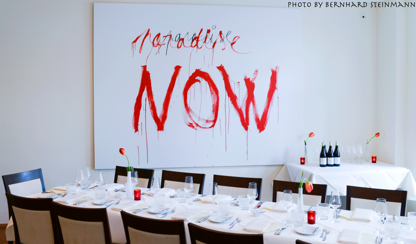 Das Restaurant ist hell und für das noble Wilmersdorf eher nüchtern. Freundlich werden wir empfangen und an einem der großen Fenster platziert. Blickfang ist zweifellos das Kunstwerk „Paradise now“ des Franzosen Georges Autard.