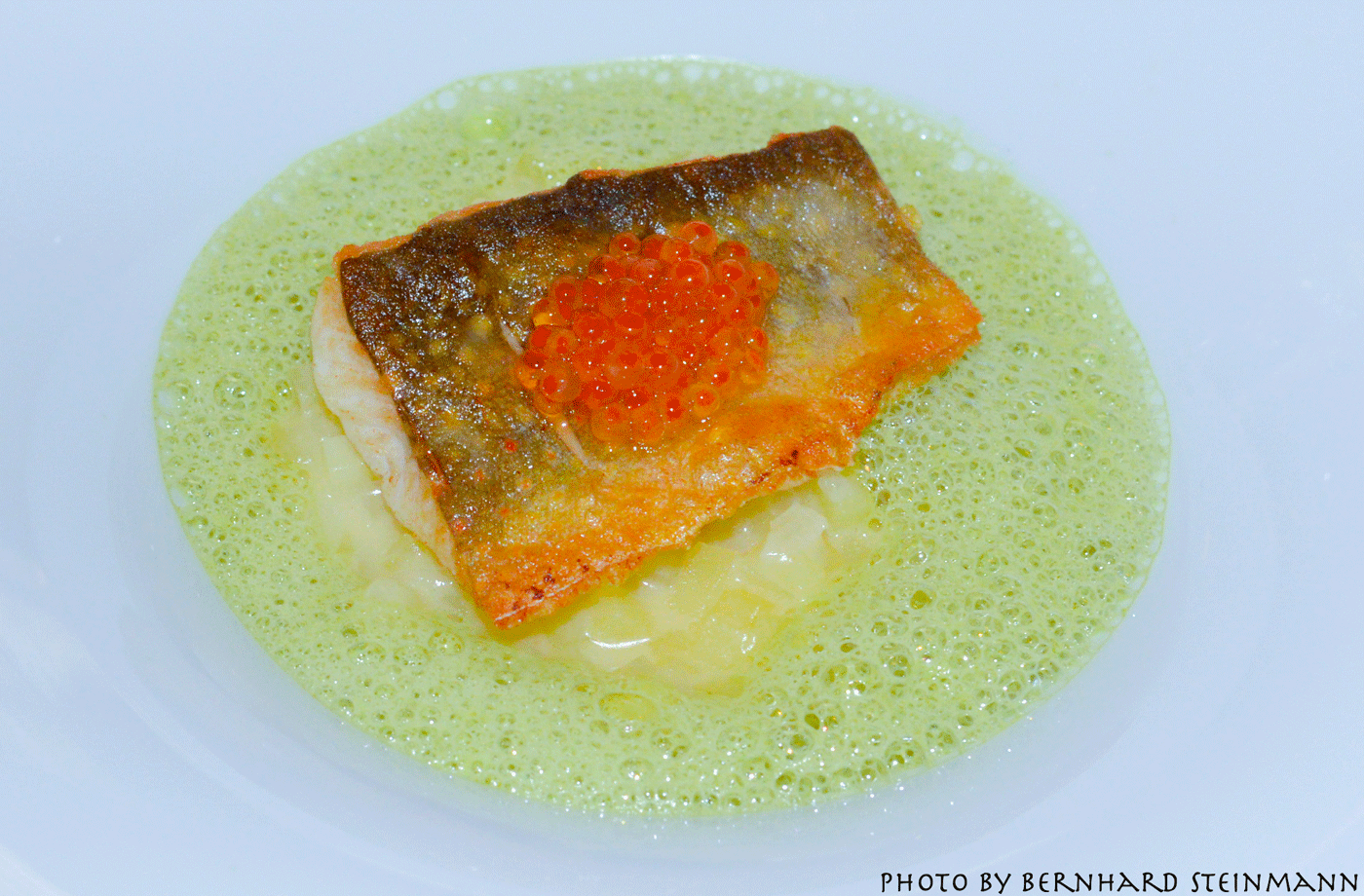 Saling aus Rottstock, Kartoffelrisotto, Bärlauch, Saiblingskaviar und Bärlauchschaum.