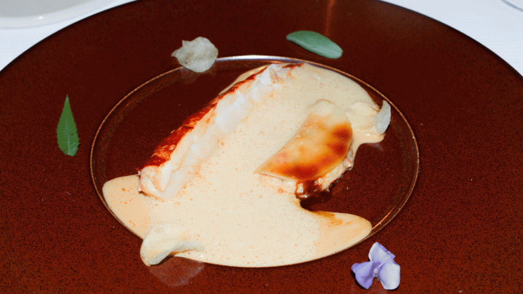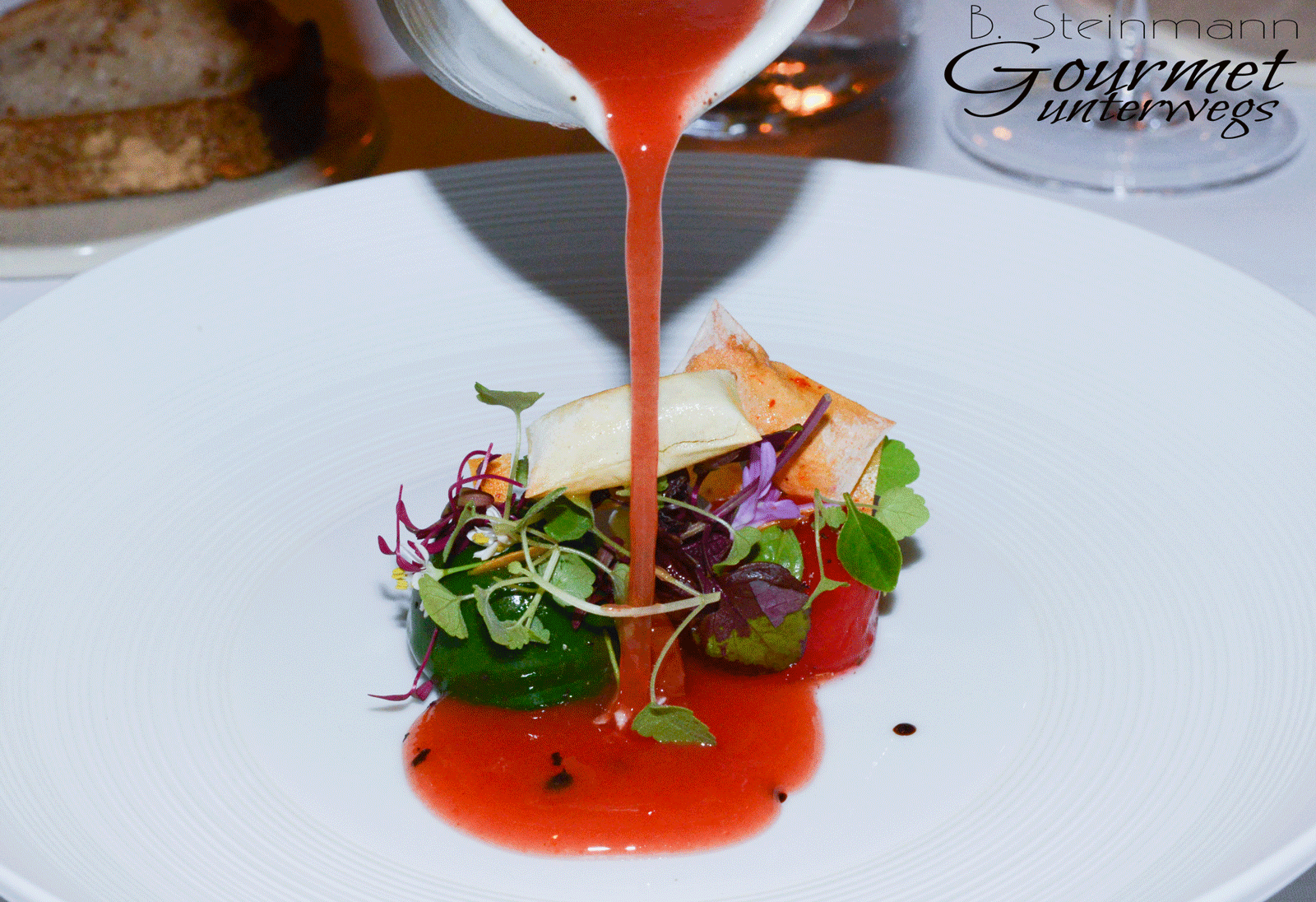 „Das Auge isst mit“, das kennen Sie alle. Für einen Restauranttester mag das eine untergeordnete Rolle spielen. Für den normalen Restaurantbesucher zählen jedoch noch weitere Fakten um von einem Abendessen einen nachhaltigen Eindruck zu bewahren. Geselligkeit und Kommunikation beeinflussen beispielsweise das Restauranterlebnis mehr als mache denken. Der Menüpreis kann Vorfreude oder Abschreckung signalisieren. Doch wie soll ich mit so einem Foto Leser zu einem Restaurantbesuch animieren? Der Hummer jedenfalls ist tadellos, der Sauce mag diesmal die gewohnte Leichtigkeit fehlen, dennoch ist sie schmackhaft. Ich bin wahrlich kein Freund von abgehobenem Tellerikebana, doch etwas mehr Mühe beim Anrichten wünsche ich mir hier schon.