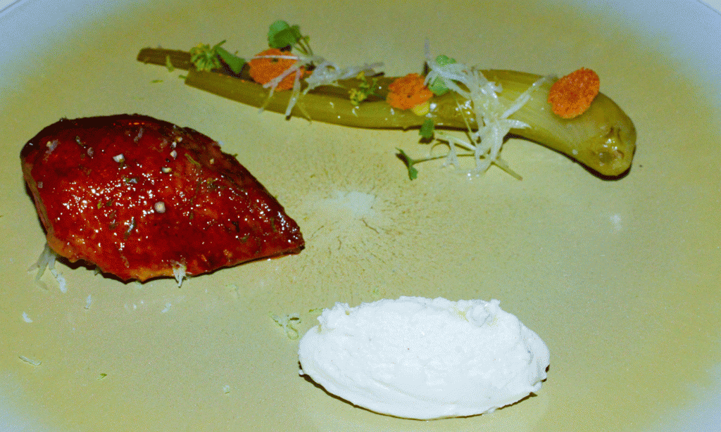 Die Taube erreicht uns mit Fenchel und Ziegenfrischkäse.